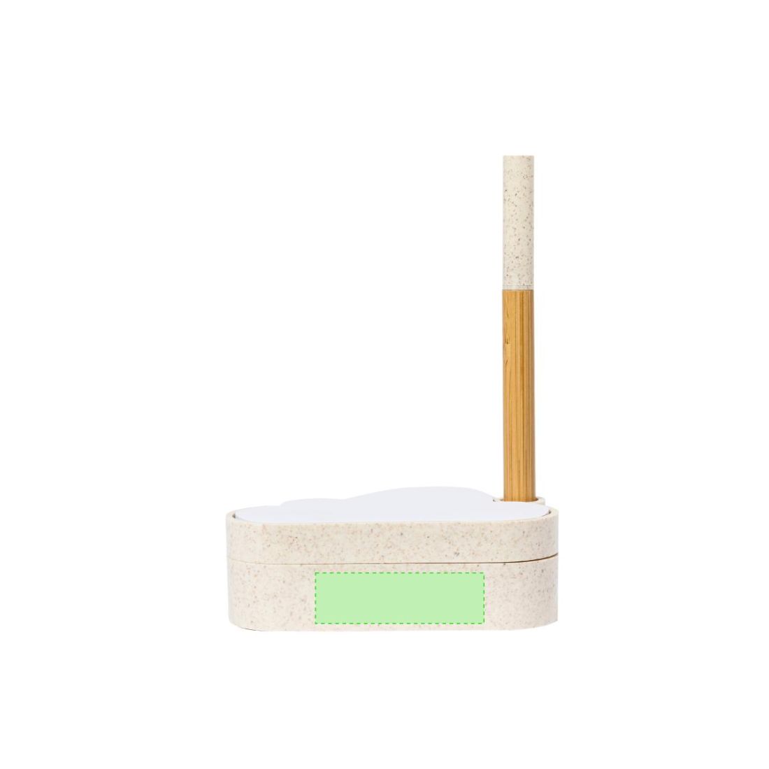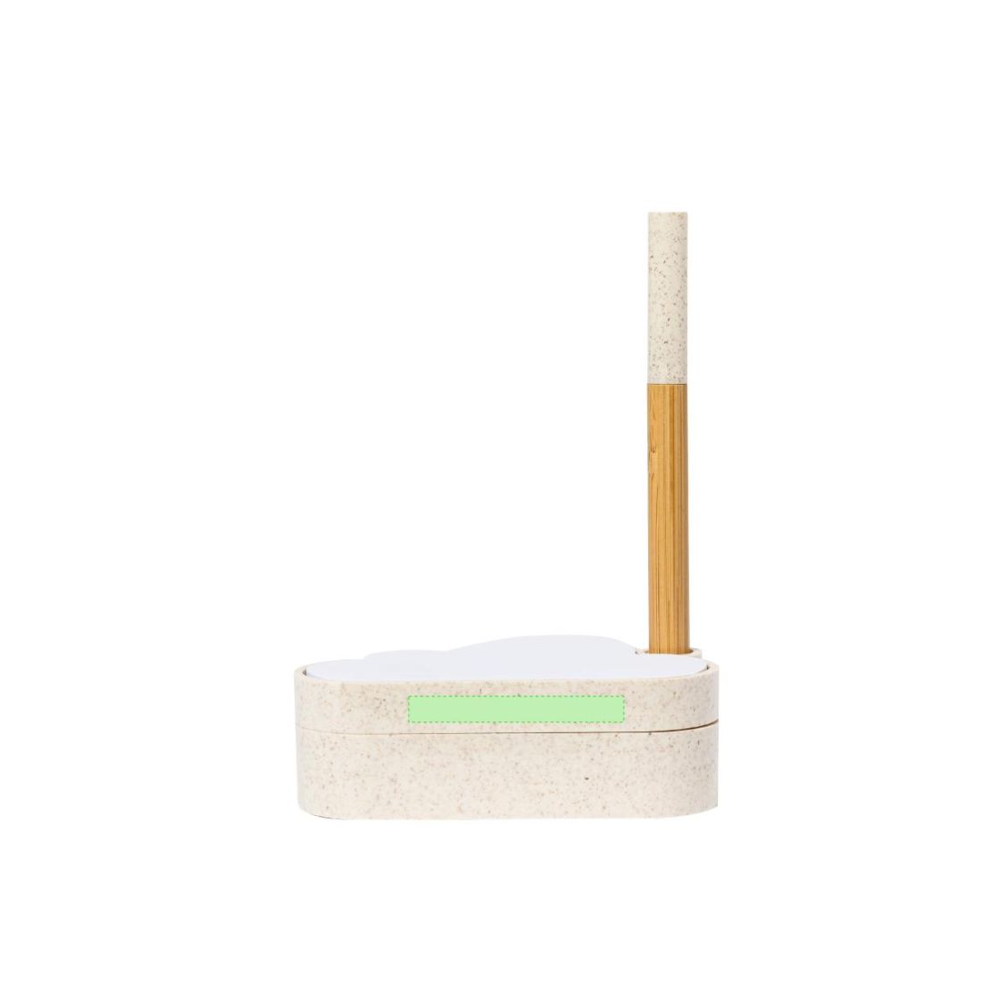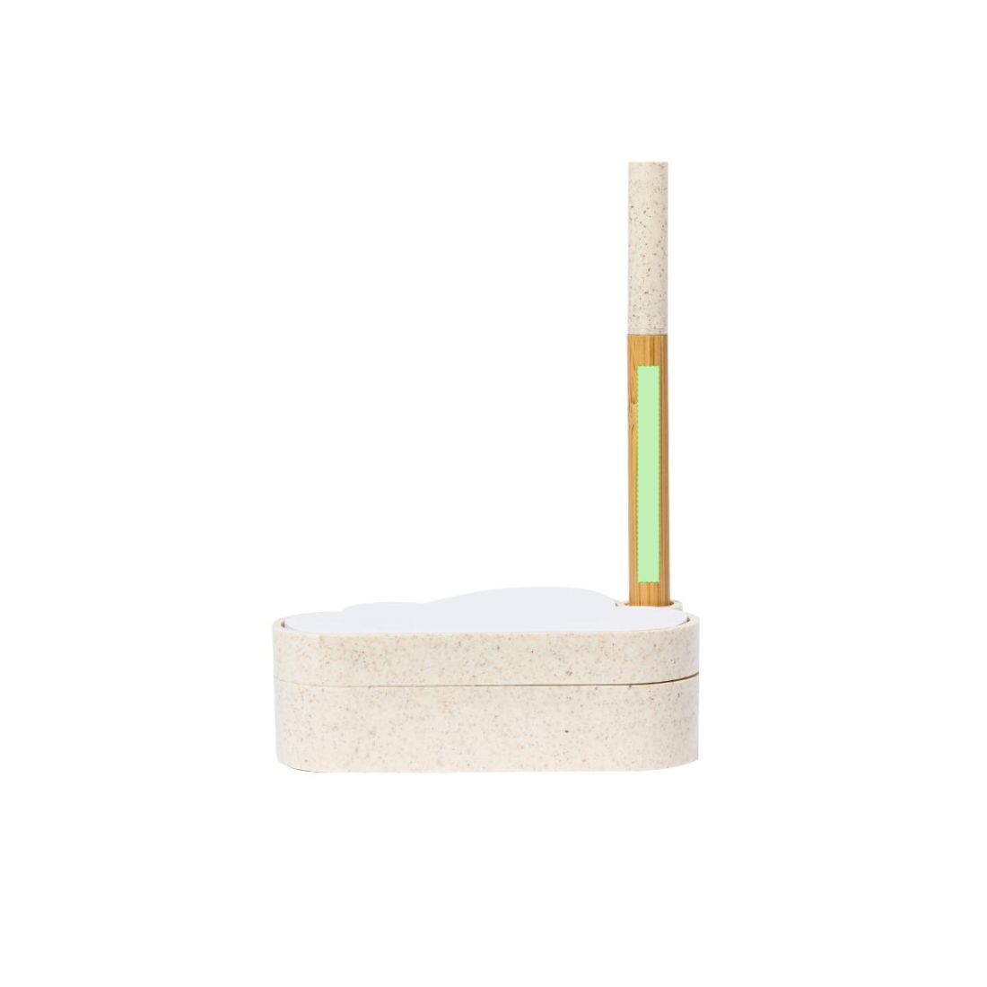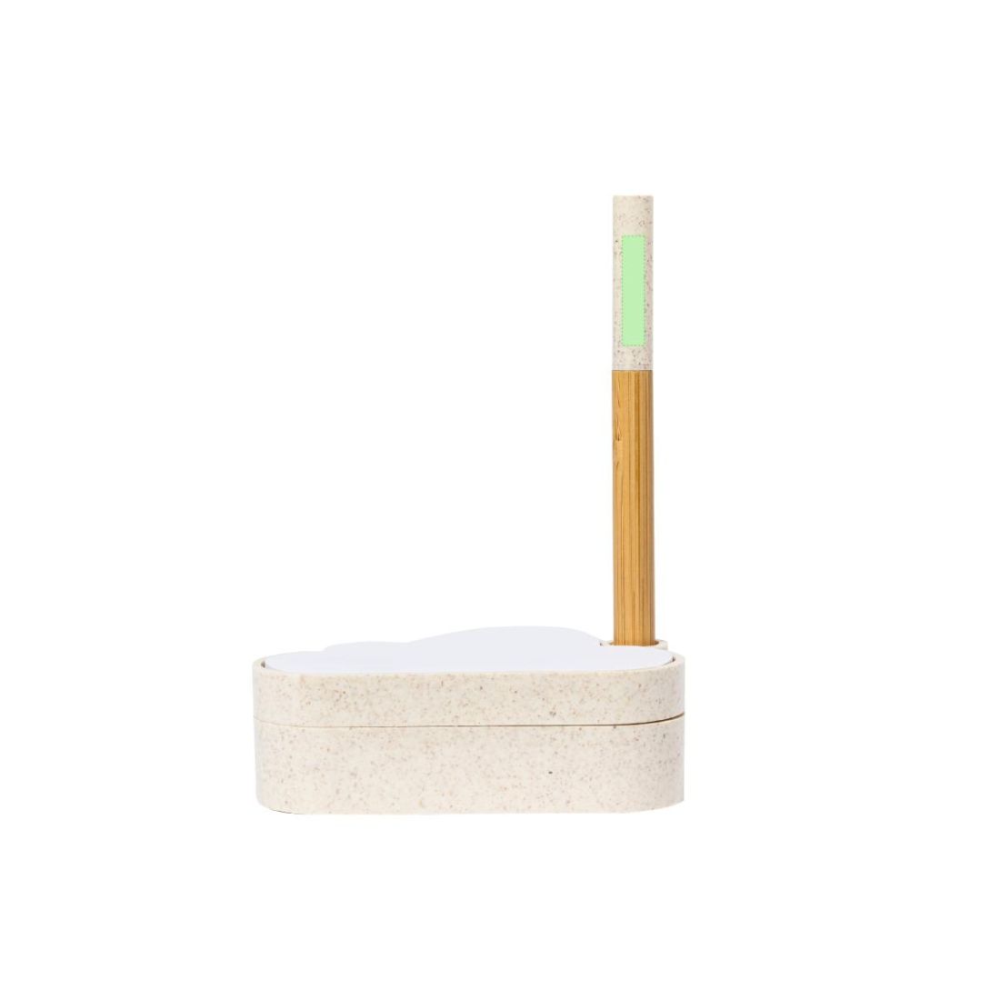 Portanotas semillas de línea nature con original diseño nube. Incluye: Bloc de 80 notas blancas en forma de nube.Base con soporte para bolígrafo y dos compartimentos, con hoja de papel semilla incluida. Fabricado en caña de trigo, para así fomentar la utilización de materias primas naturales y reducir las emisiones contaminantes.Bolígrafo puntero con cuerpo fabricado en bambú capucha y detalles en caña de trigo. En tinta azul.Set presentado en caja individual de diseño kraft, con manual de instrucciones en español e inglés.