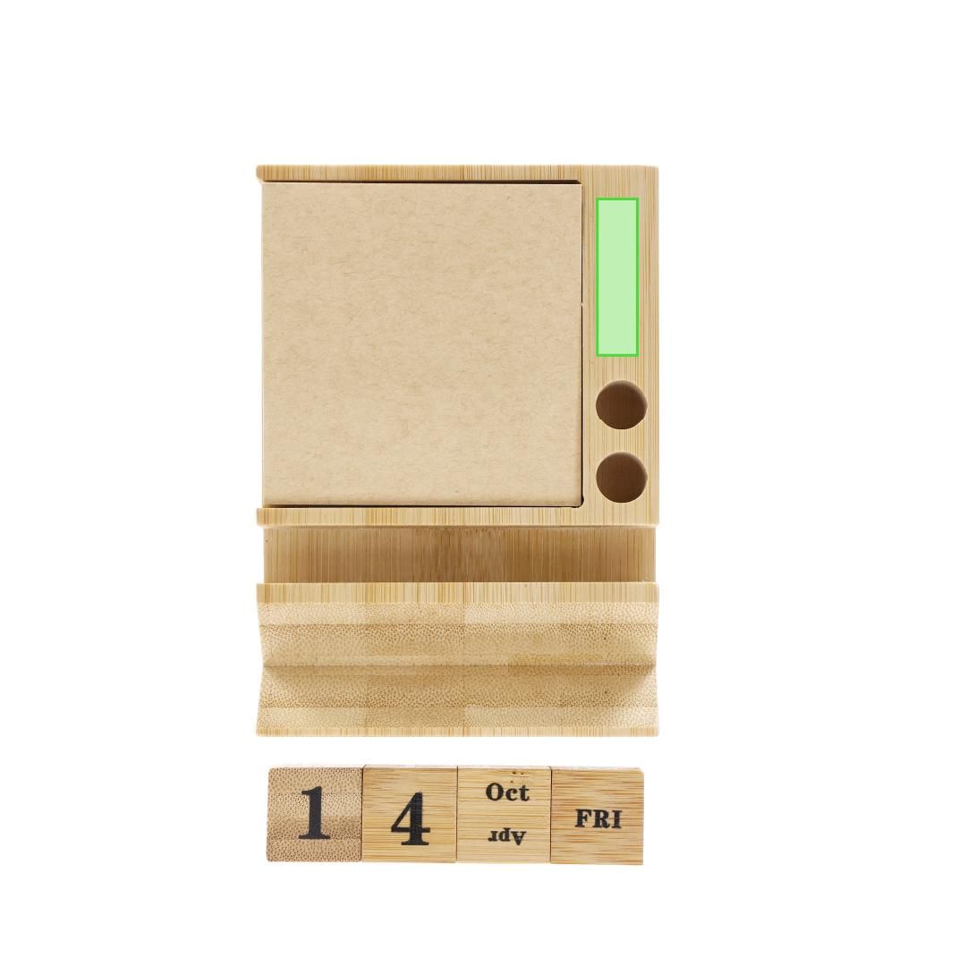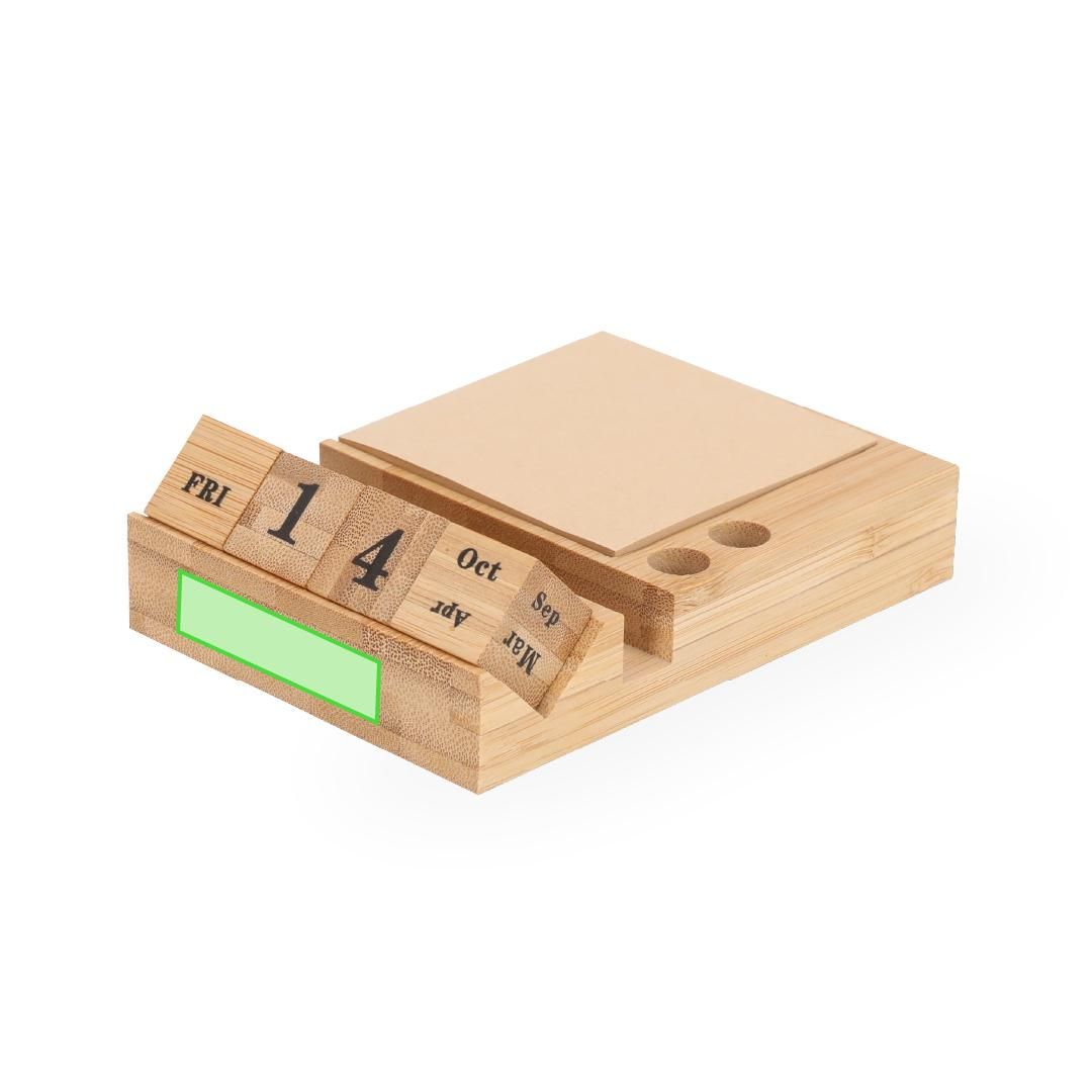 Portanotas calendario perpetuo con soporte, fabricado en bambú. Este elegante calendario perpetuo está compuesto por cubos que indican los días de la semana, los meses y los días del mes. Incluye soporte para smartphone, 100 notas adhesivas de papel kraft y soporte para dos bolígrafos. Perfecto para mantener tu escritorio organizado y estilizado.Materiales como el Bambú fomentan la utilización de materias primas naturales reduciendo las emisiones contaminantes. Además, el Bambú proviene de una planta de gran resistencia y versatilidad, con crecimiento y regeneración rápida, siendo una excelente alternativa al uso de madera tradicional.