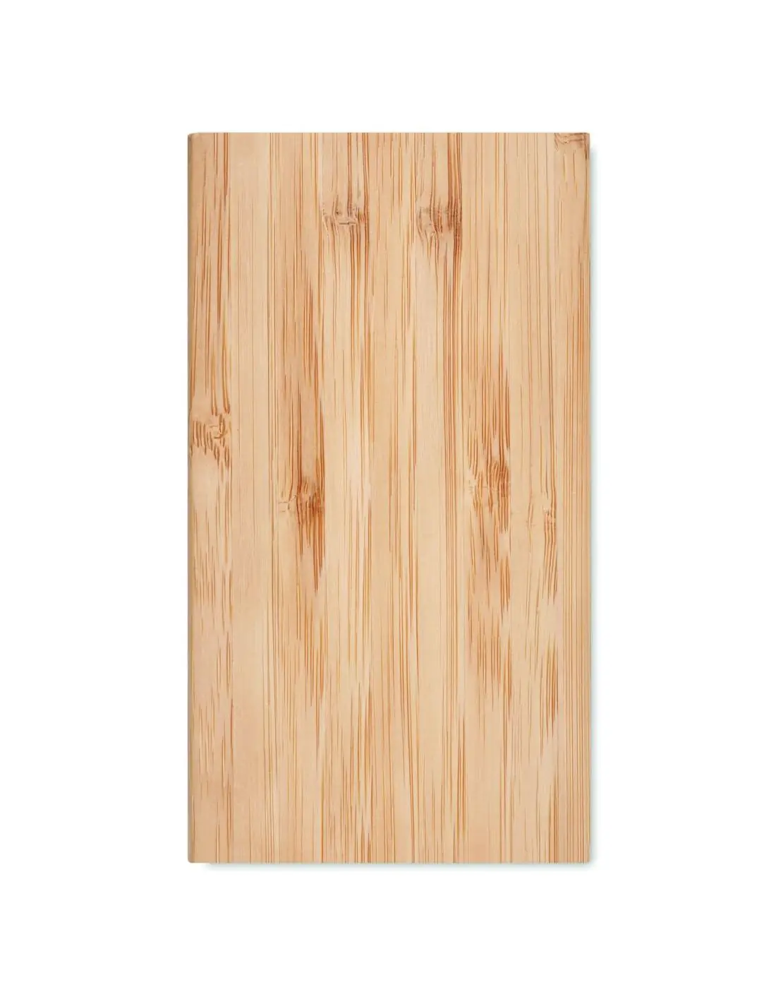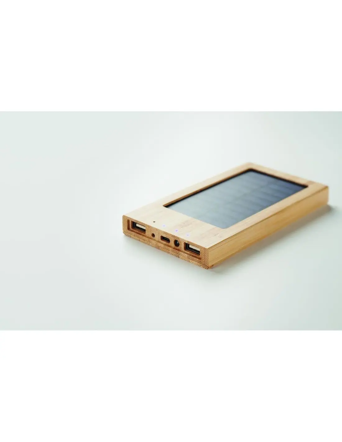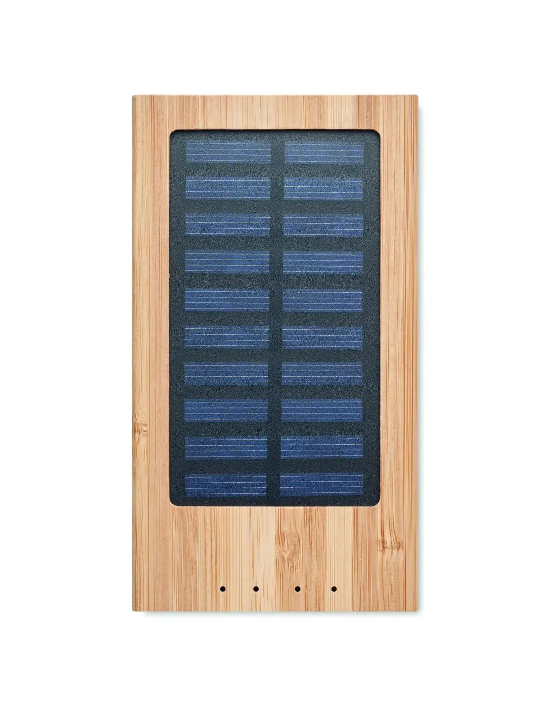 Power bank con carcasa de bambú y panel solar de 4000 mAh. Compatible con smartphones, 2 salidas USB DC5V/1A. Incluye luz indicadora y cable USB con enchufe micro USB. El bambú es material natural, el color del articulo puede variar.