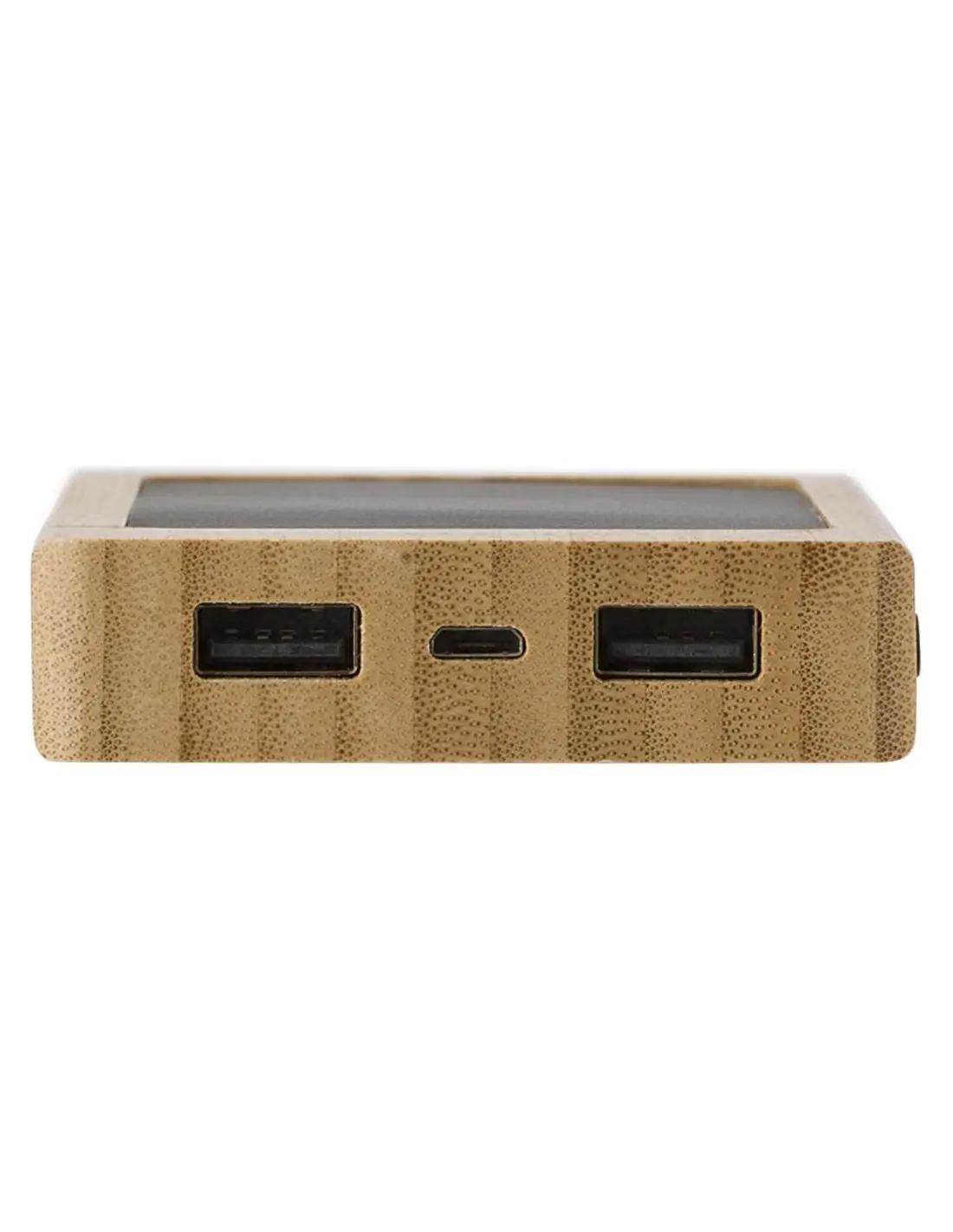 Power Bank solar de bambú, de 8.000 mAh. Dos puertos USB y un puerto micro USB y cuatro indicadores LED. Entrada: DC 5V / 2A, salida: DC 5V / 2A. Cable incluido.