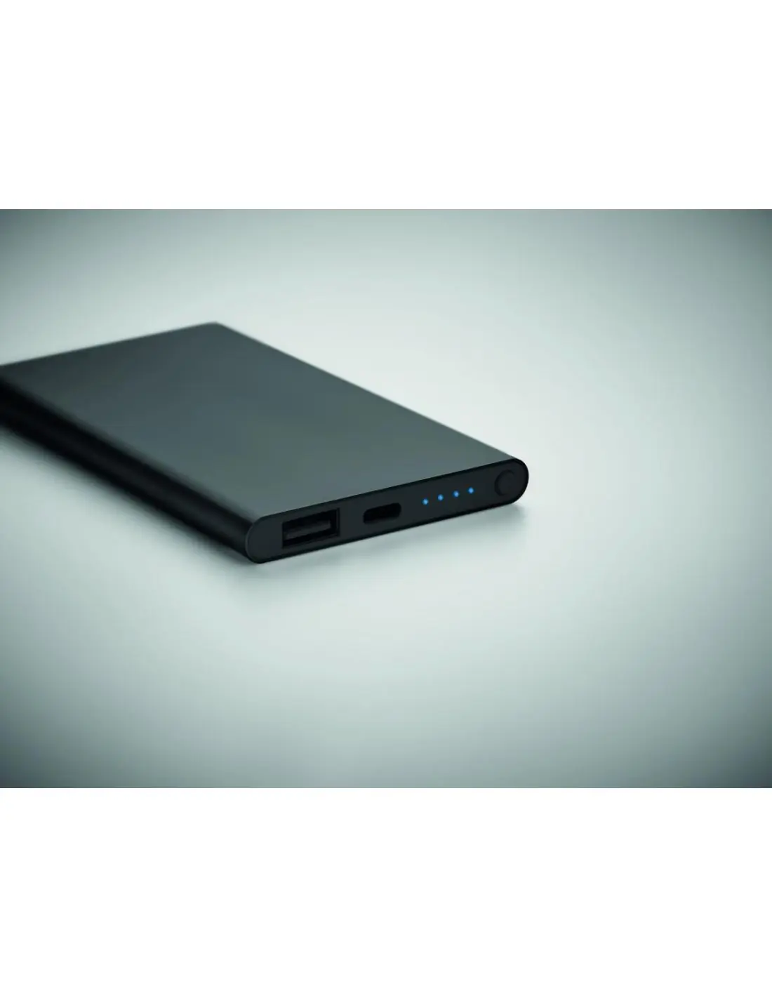 Power bank de 4000 mAh de capacidad en aluminio reciclado. Corriente de salida DC5V/2A. Incluye luz indicadora y cable USB con Tipo C. Entrada/Sali…