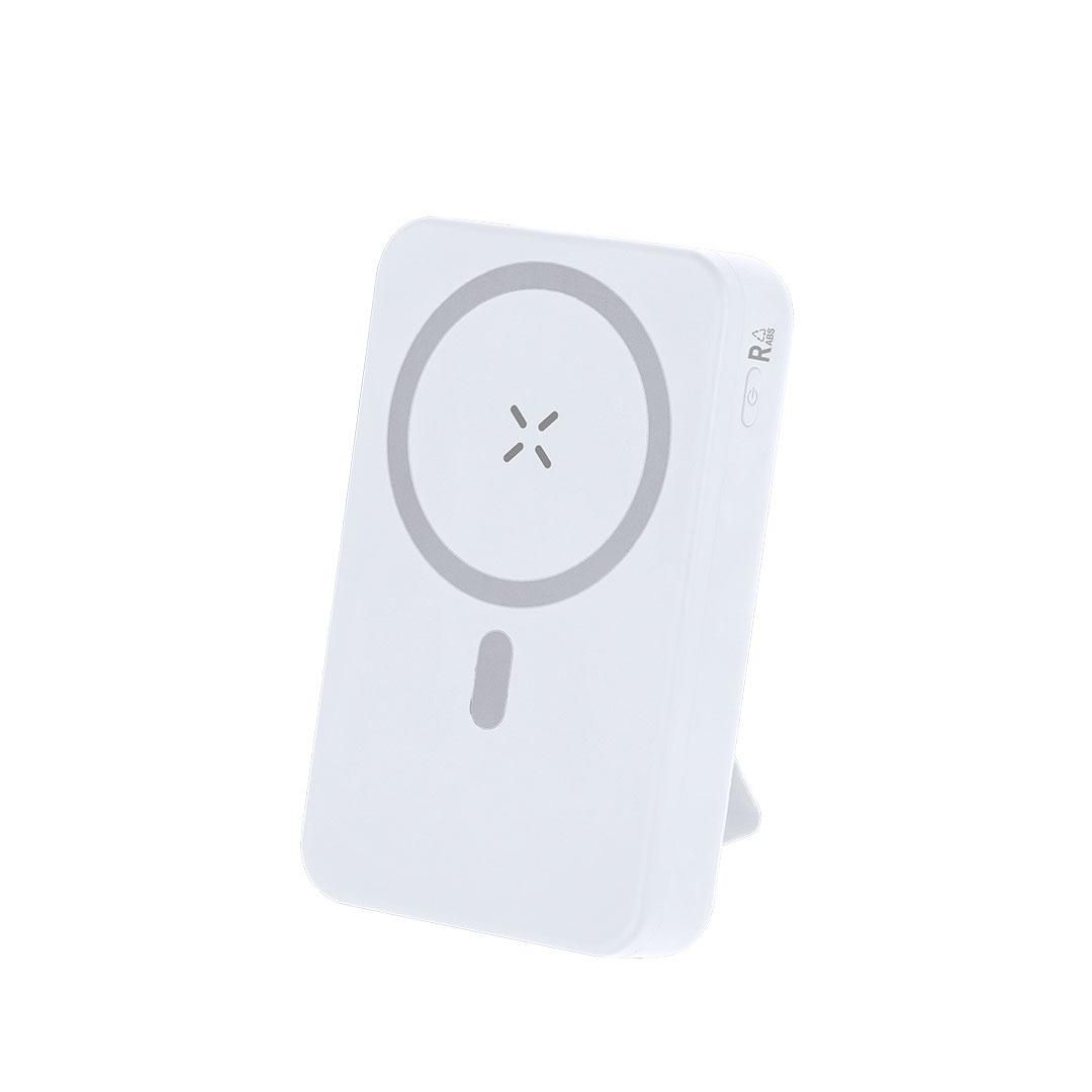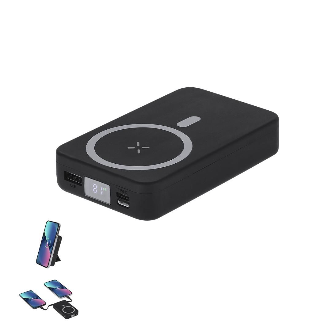 Batería auxiliar externa de 15W gran capacidad de carga 10.000 mAh en ABS Reciclado. Con fijación magnética Magsafe. Cuenta con 1 salida USB, Lightning, Micro USB y entradas Tipo C y Lightning. Además, cuenta con práctico y funcional soporte para poner tu smartphone verticalmente. Incluye distintivo logotipo RABS.