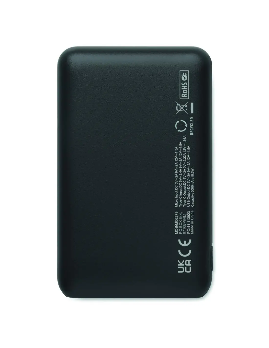 Power bank 5000 mAh en ABS reciclado. Corriente de salida DC5V/2A 2x entrada/salida tipo A y 1x tipo C y 1x entrada tipo micro-B.