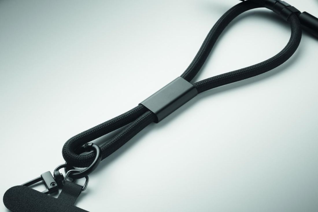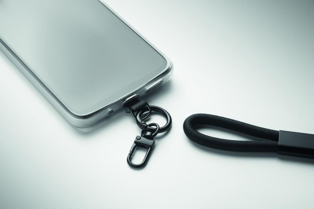 Pulsera cable de carga y datos de 60 W de tipo C a tipo C en RPET con soporte para cable de teléfono y clip para llaves.