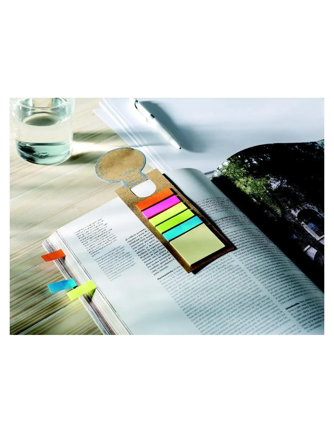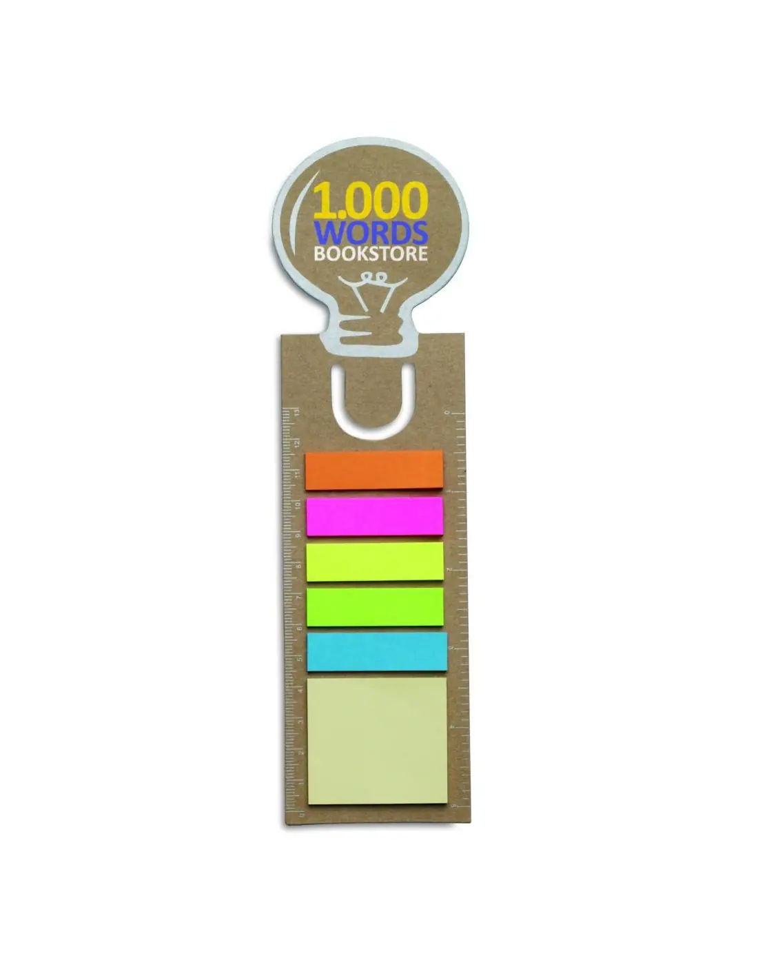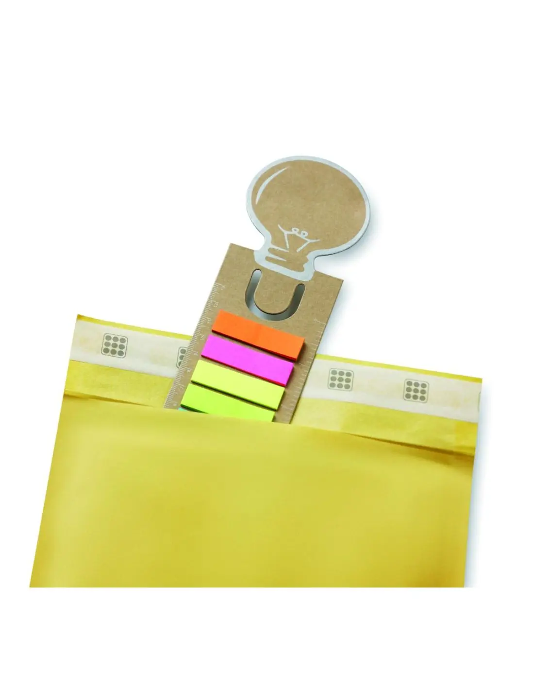 Marcapáginas con forma de bombilla en cartón reciclado. Bloc de notas adhesivas de 2 unidades. Bloc de notas adhesivas de papel reciclado amarillo mediano y 5 marcadores de página de colores surtidos. Regla de 13 cm.