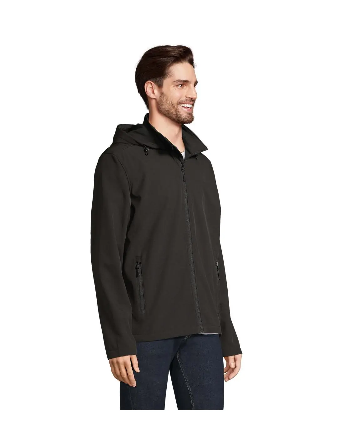SOL'S RACE HOODED MEN, chaqueta softshell con capucha para hombre, 100% poliéster reciclado Forro polar: 100% poliéster reciclado 2 capas, Cierre frontal y bolsillos laterales con cremallera de nailon negro Tiradores de cremallera negros Capucha con cordón de ajuste Espalda ligeramente más larga. Acerca de la correspondencia de tallas, consulte la tabla de tallas en la sección de documentación del producto.