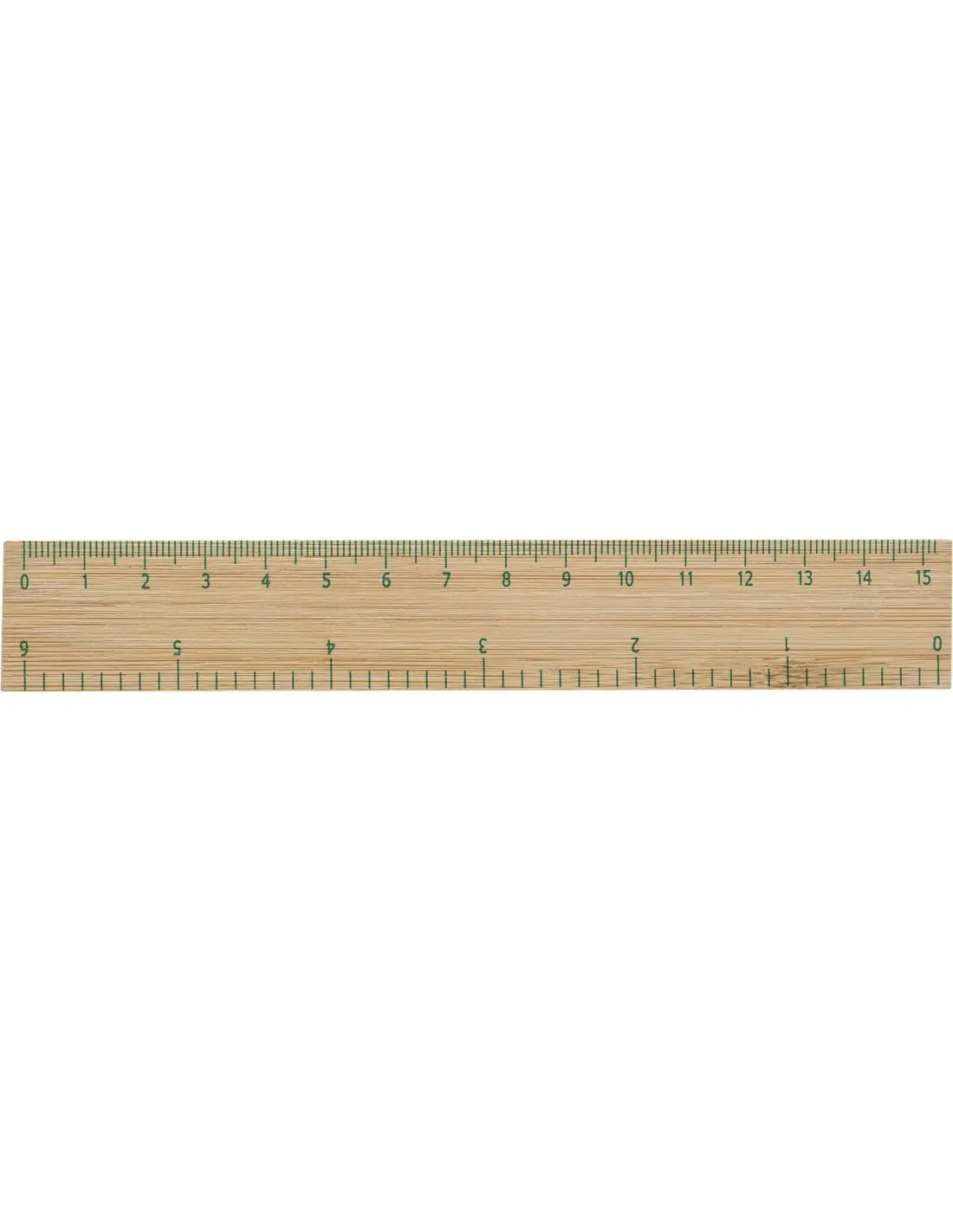 Regla de bambú. Centímetros en un lado (0-15 cm) y pulgadas en el otro lado (0-6 “).