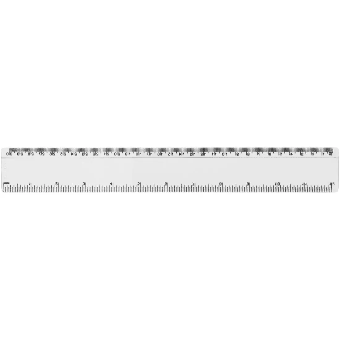 Regla de plástico rígida con marcas tanto en pulgadas como en centímetros. Tenga en cuenta que las marcas de la regla se imprimen junto con los logos, las reglas estándar de stock no llevarán marcas.