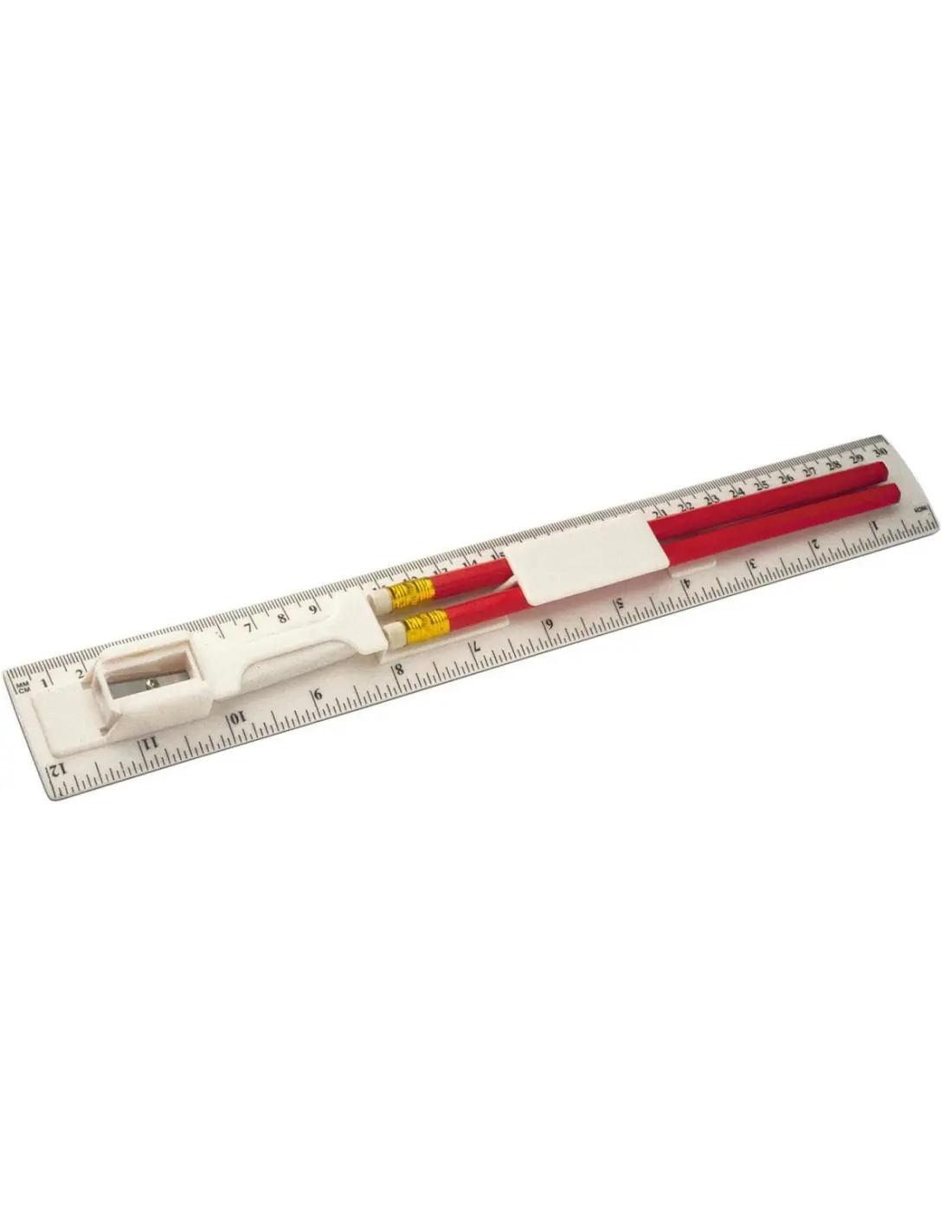 Regla de 30 cm con 2 lápices, sacapuntas y goma de borrar.
