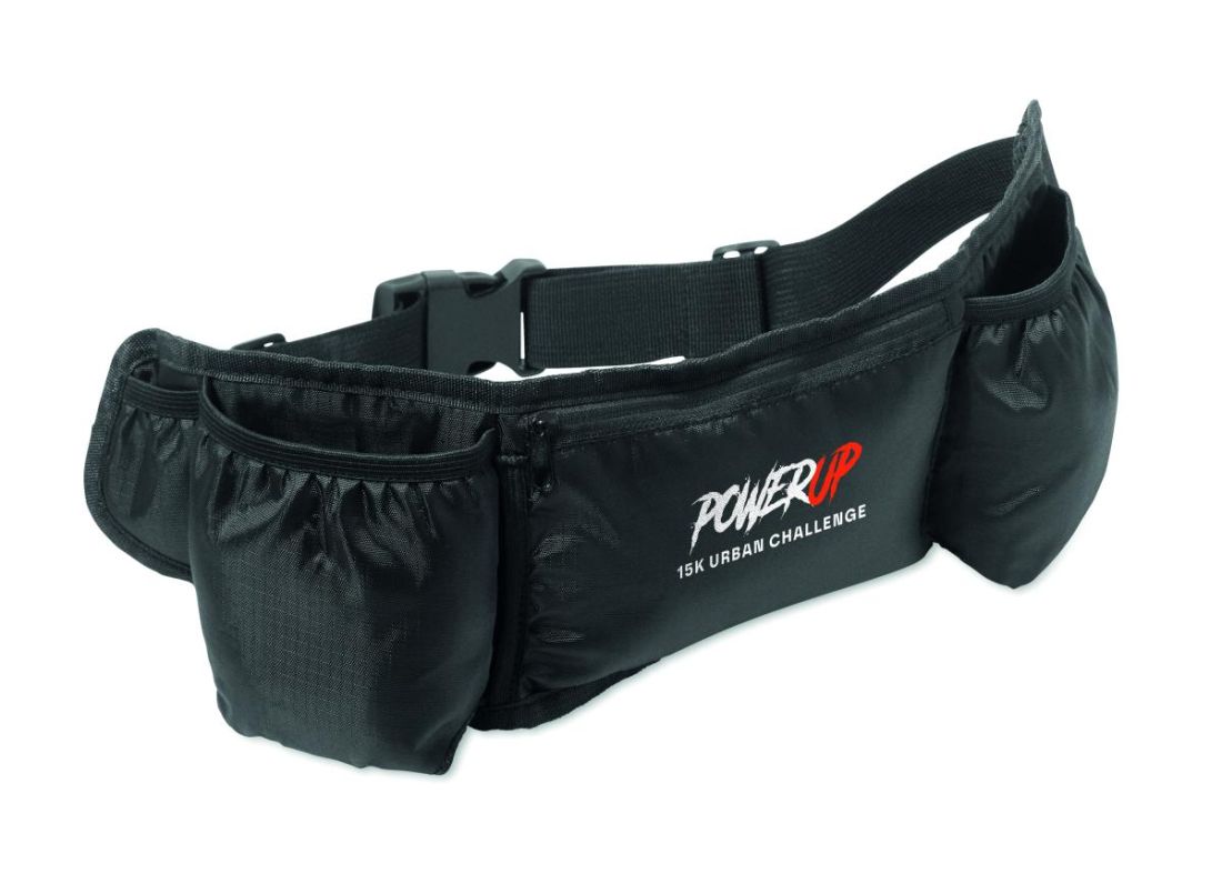 Riñonera para running y senderismo de poliéster 420D RPET con parte trasera de malla. Dos compartimentos para botellas, bolsillo central con cremal…