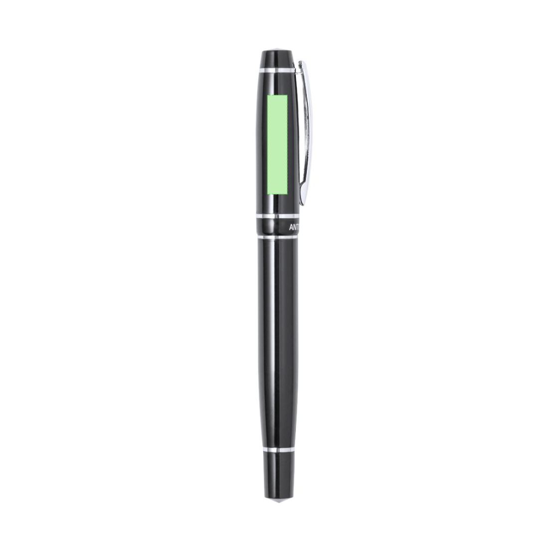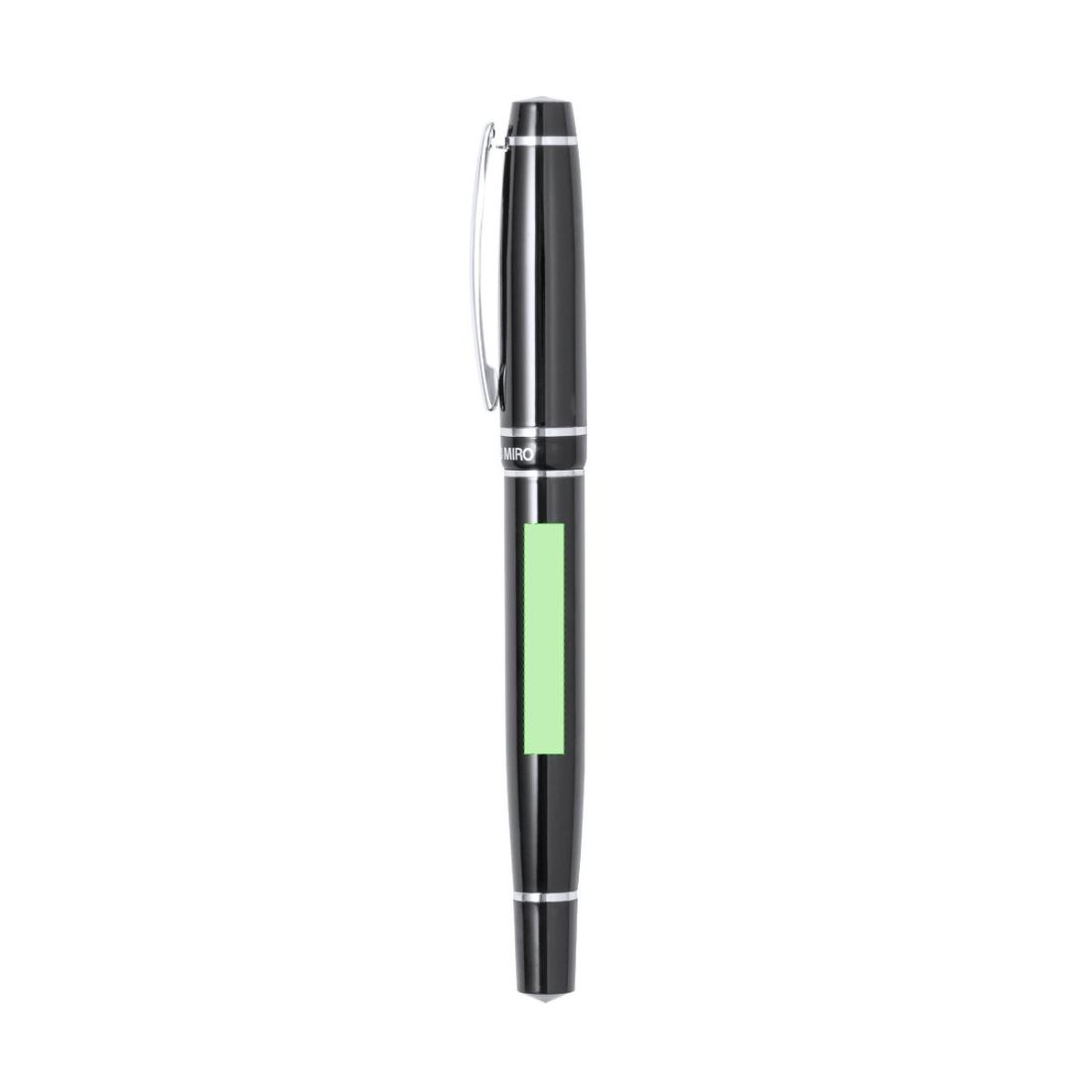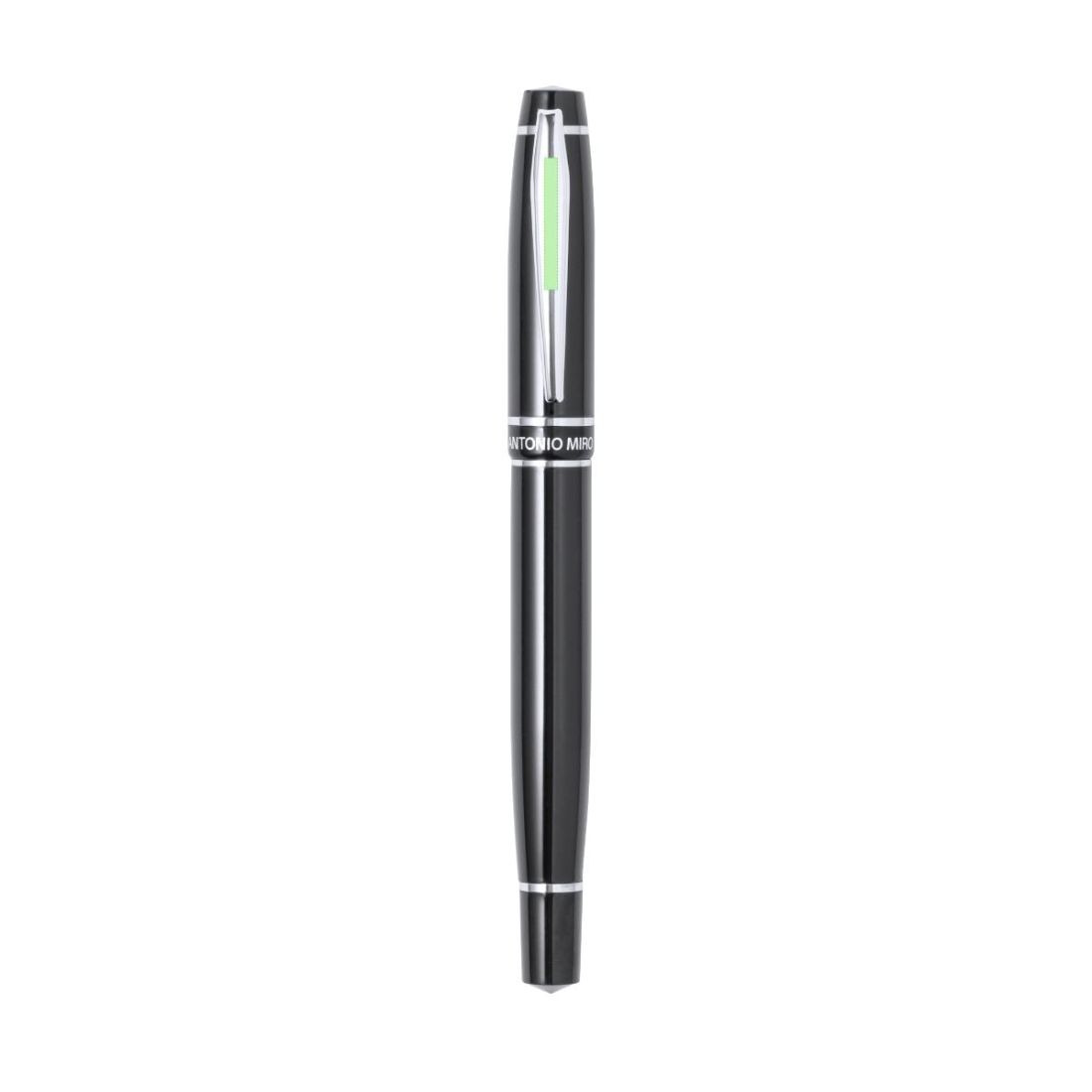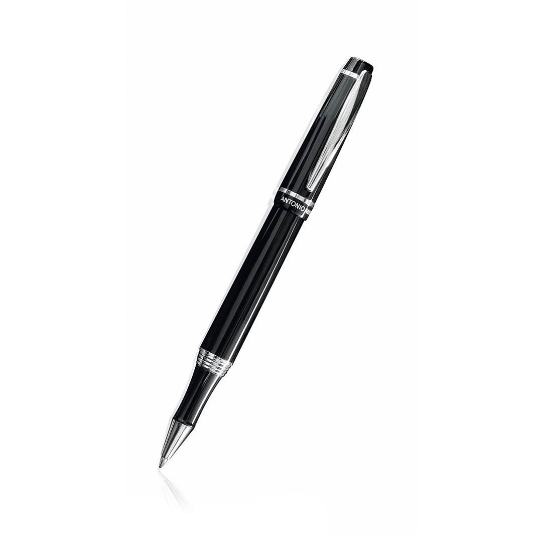 Roller de capucha de Antonio Miró en elegante diseño bicolor y suave cuerpo metálico en sobrio color negro. Con logotipo de la marca bajo la anilla, clip y punta en acabado plateado brillante. Presentado en estuche individual en color negro con logotipo de la marca. En tinta azul.