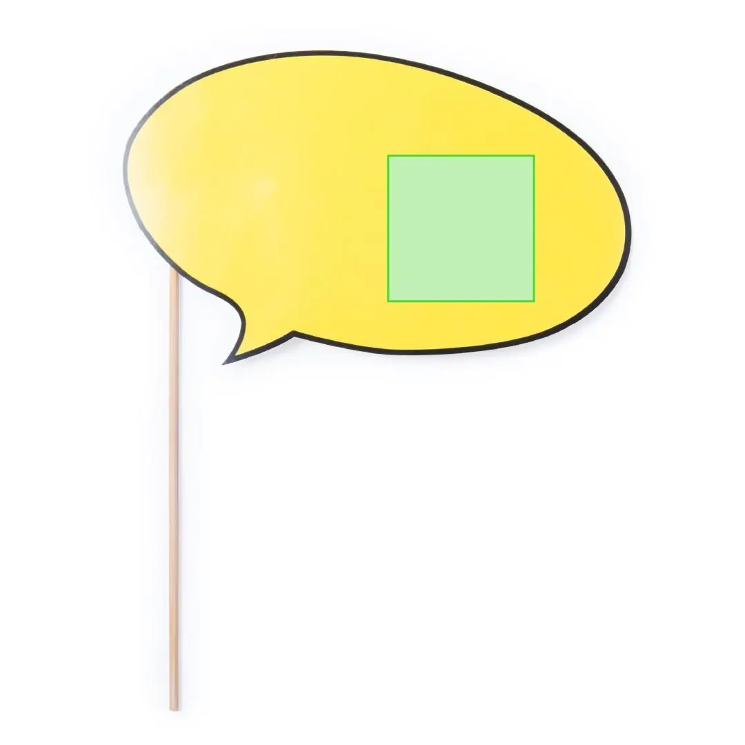 Selfie bocadillo en llamativo color amarillo con amplia superficie de impresión. En papel de alto gramaje con mango de madera.