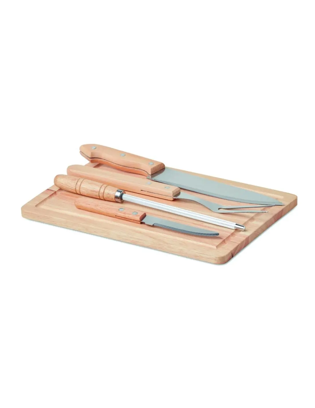 Set de 4 accesorios de barbacoa de acero inoxidable con tabla de cortar de madera, presentado en estuche de poliéster. Incluye cuchillos, tenedor y afilador.El bambú es un material natural, el color del articulo, la medida y la impresión sobre el puede variar.