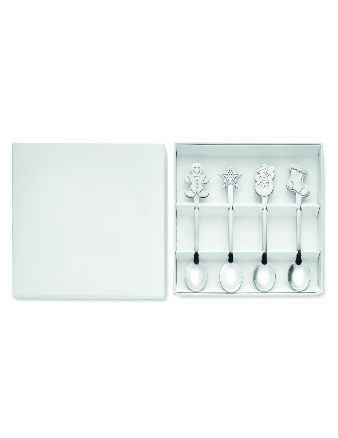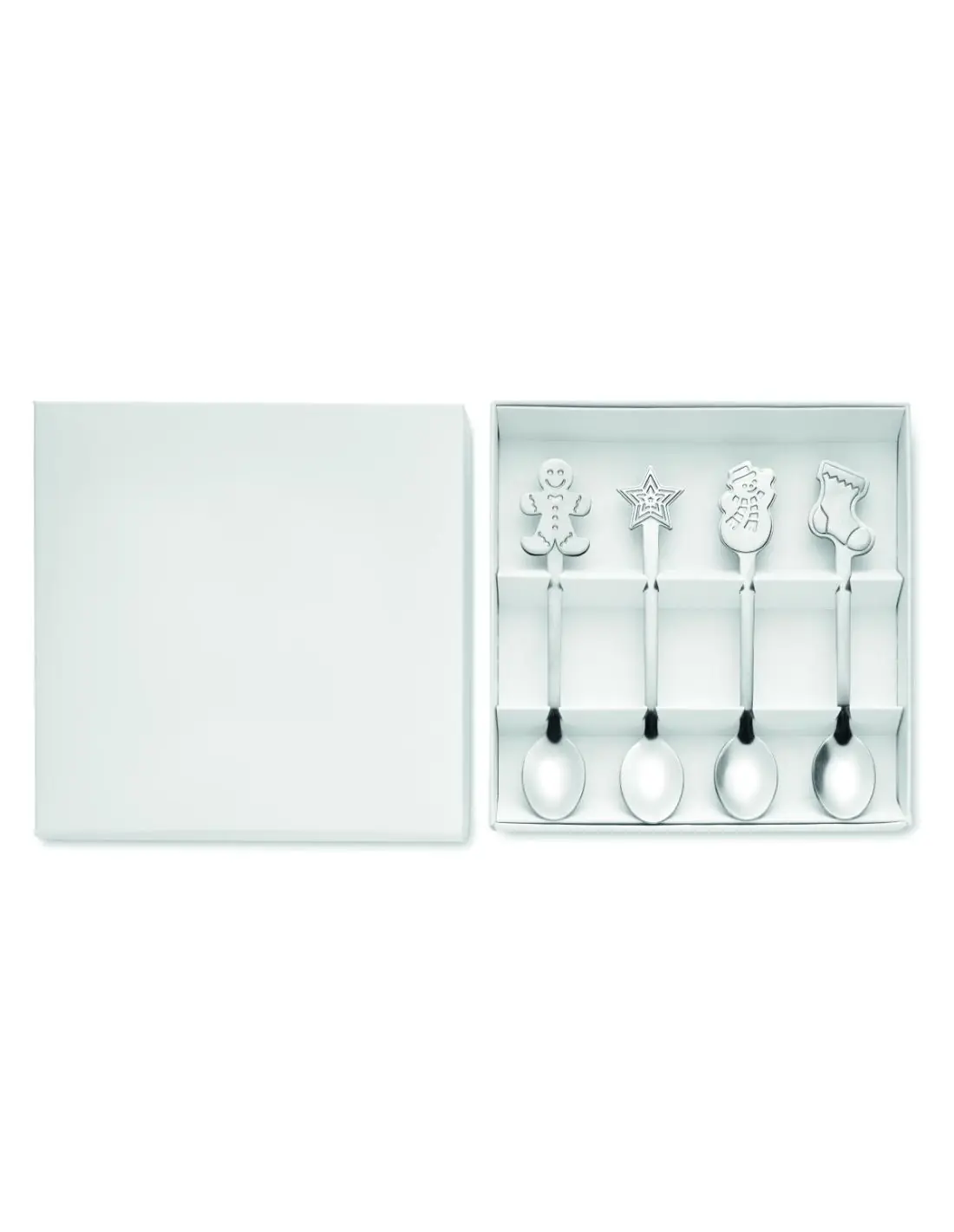 Juego de 4 cucharas de té de acero inoxidable con motivos navideños. Presentadas en caja de regalo.