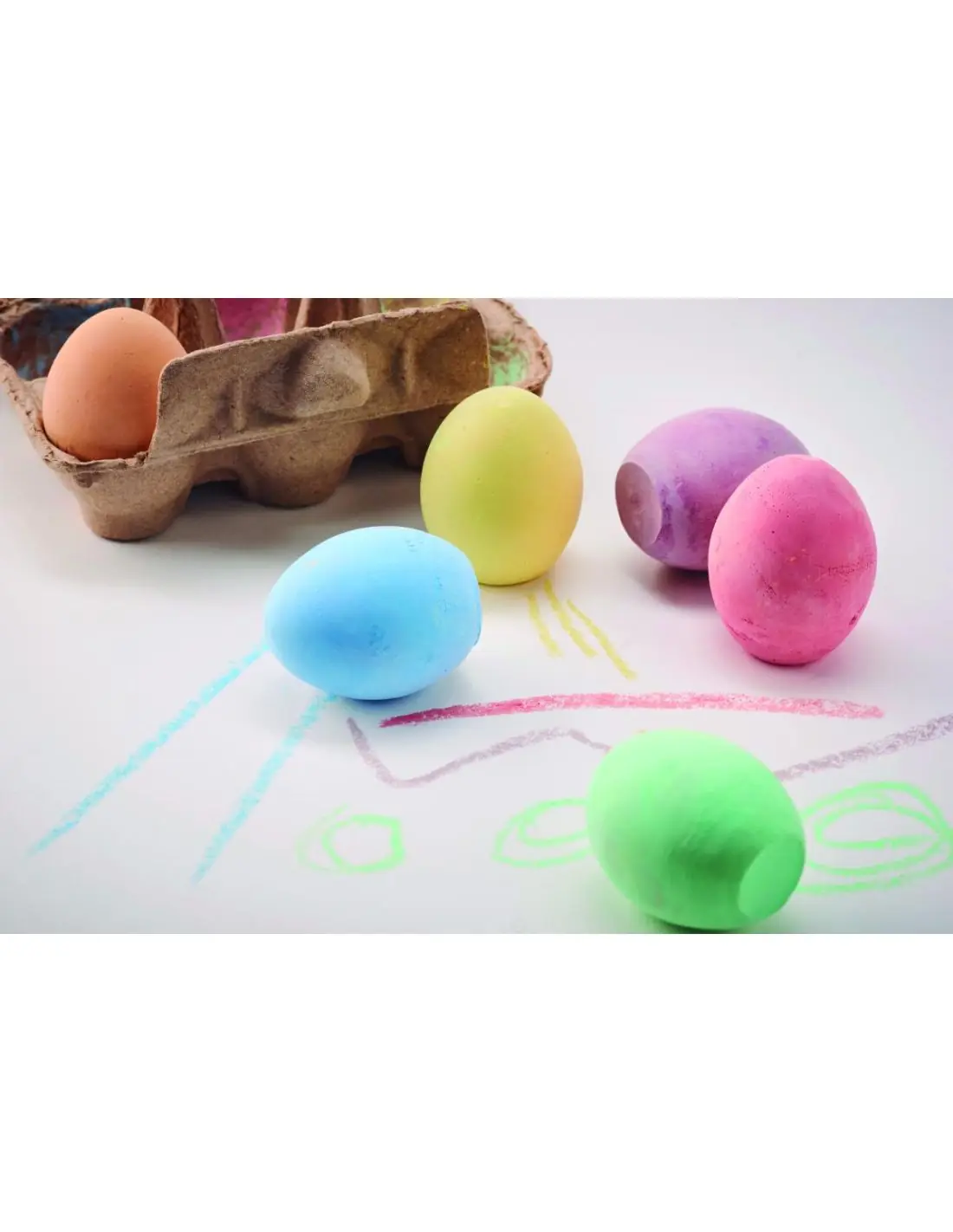 Juego de 6 tizas en forma de huevo presentado en una caja huevera de cartón reciclado.