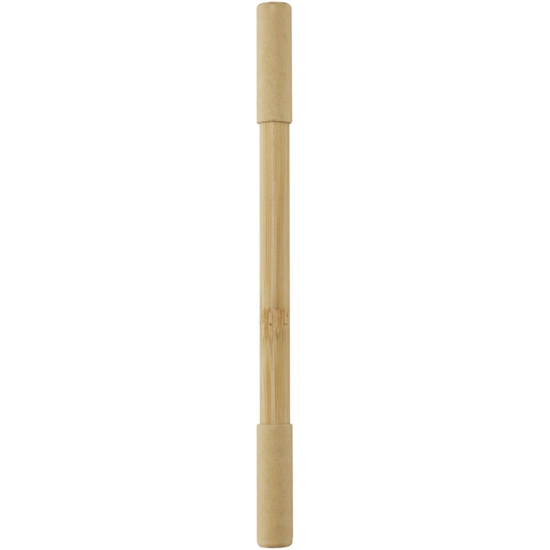 El bolígrafo doble de bambú tiene dos puntas: 1 bolígrafo con tinta y 1 bolígrafo sin tinta. La punta sin tinta no requiere cartuchos de tinta ni recambios. La punta de grafito negro del bolígrafo se ha diseñado para dejar un rastro visible al entrar en contacto con la superficie de escritura. Elegir un bolígrafo de bambú promueve la toma de decisiones más sostenibles y fomenta el uso de materiales renovables. El bolígrafo tiene tinta azul, un tamaño de la punta de 1,00 mm y una longitud de escritura de 600 metros. Longitud de escritura del bolígrafo sin tinta: 1500 metros.