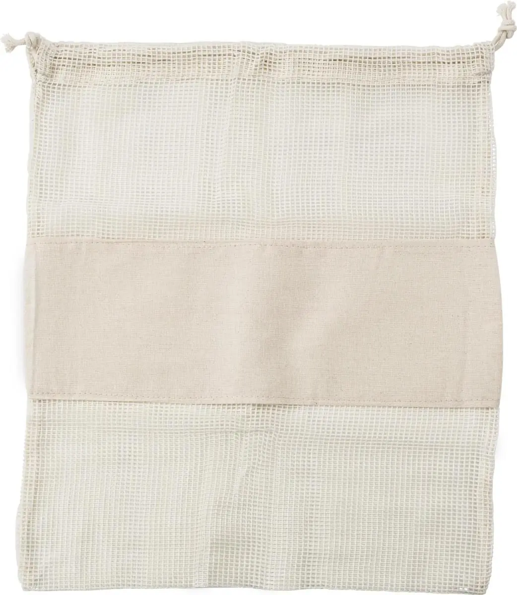 Set de 3 bolsas de malla de algodón orgánico, presentadas en una funda de papel kraft. Se cierran con un cordón y tienen un panel de algodón en la …