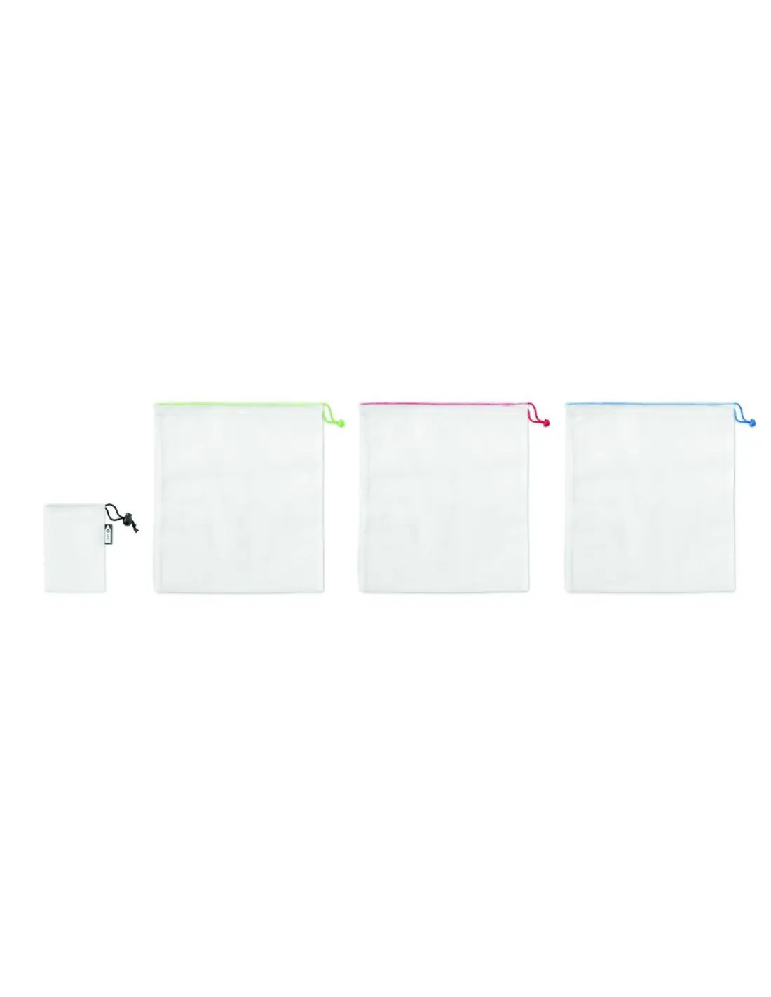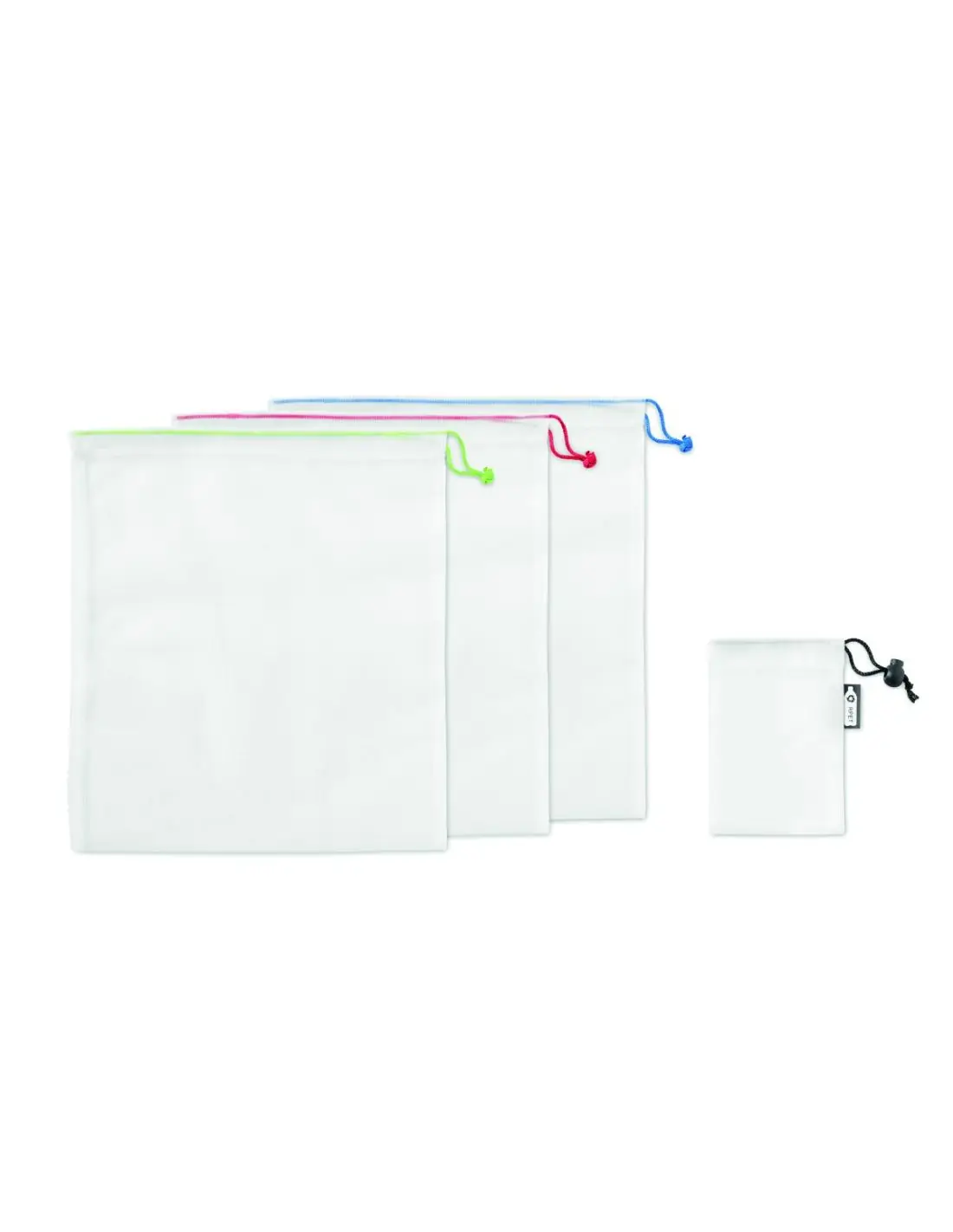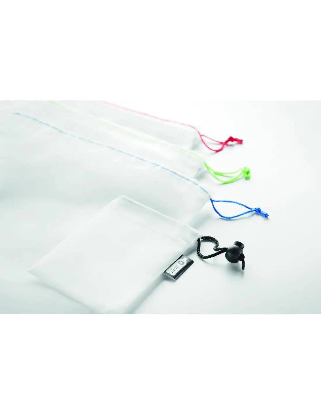 Set de 3 bolsas en RPET. Reutilizable para fruta o vegetales, buena alternativa a las bosas de plástico. Cierre de cordón. Apto para lavadora, sin BPA y seguro para alimentos (food-safe).