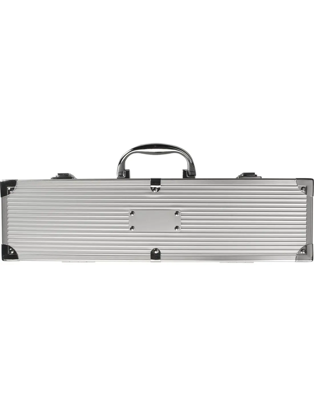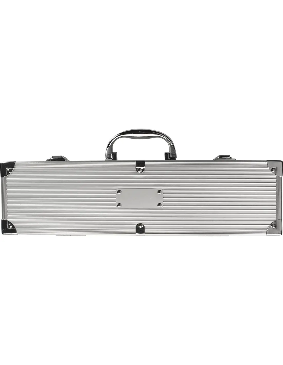 Set de 3 utensilios de acero inoxidable para barbacoa en una caja de aluminio.