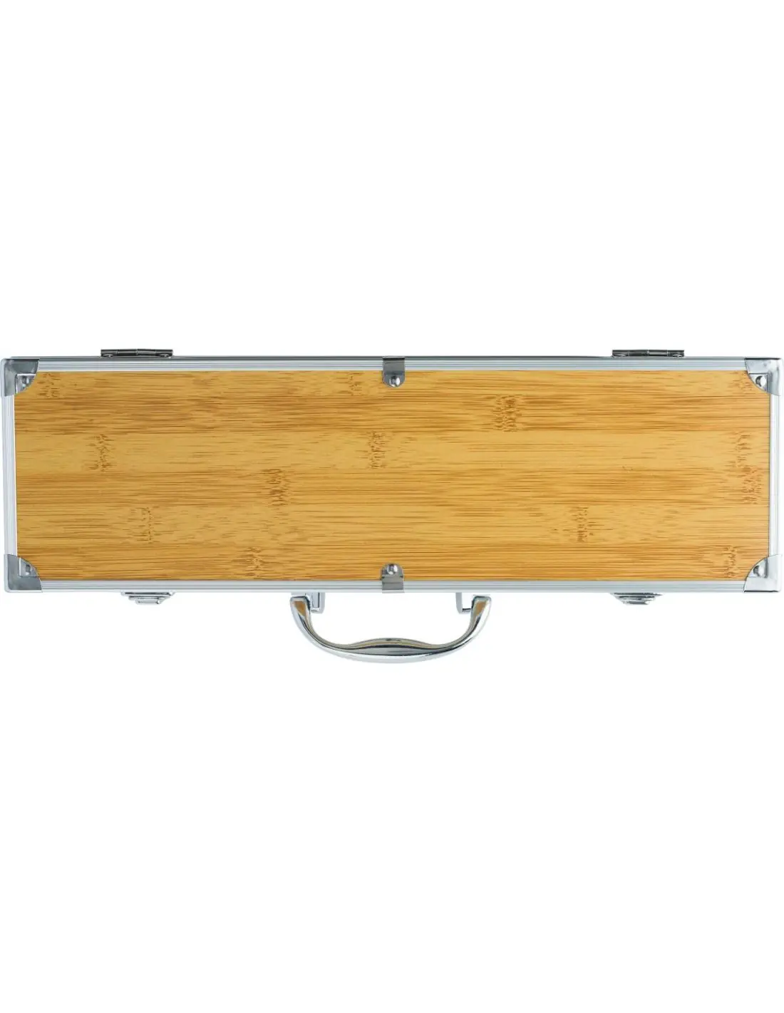 Set de barbacoa con 3 piezas de acero y bambú: tenedor, espátula y pinzas. Presentado en una caja de aluminio con símil de bambú en la tapa.