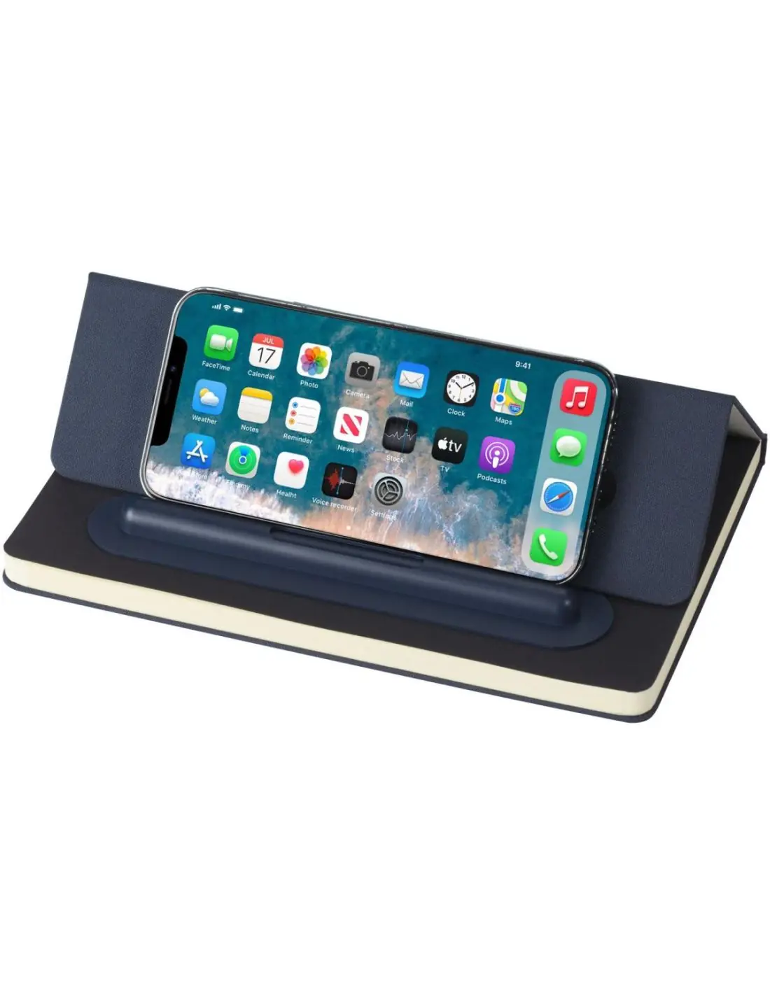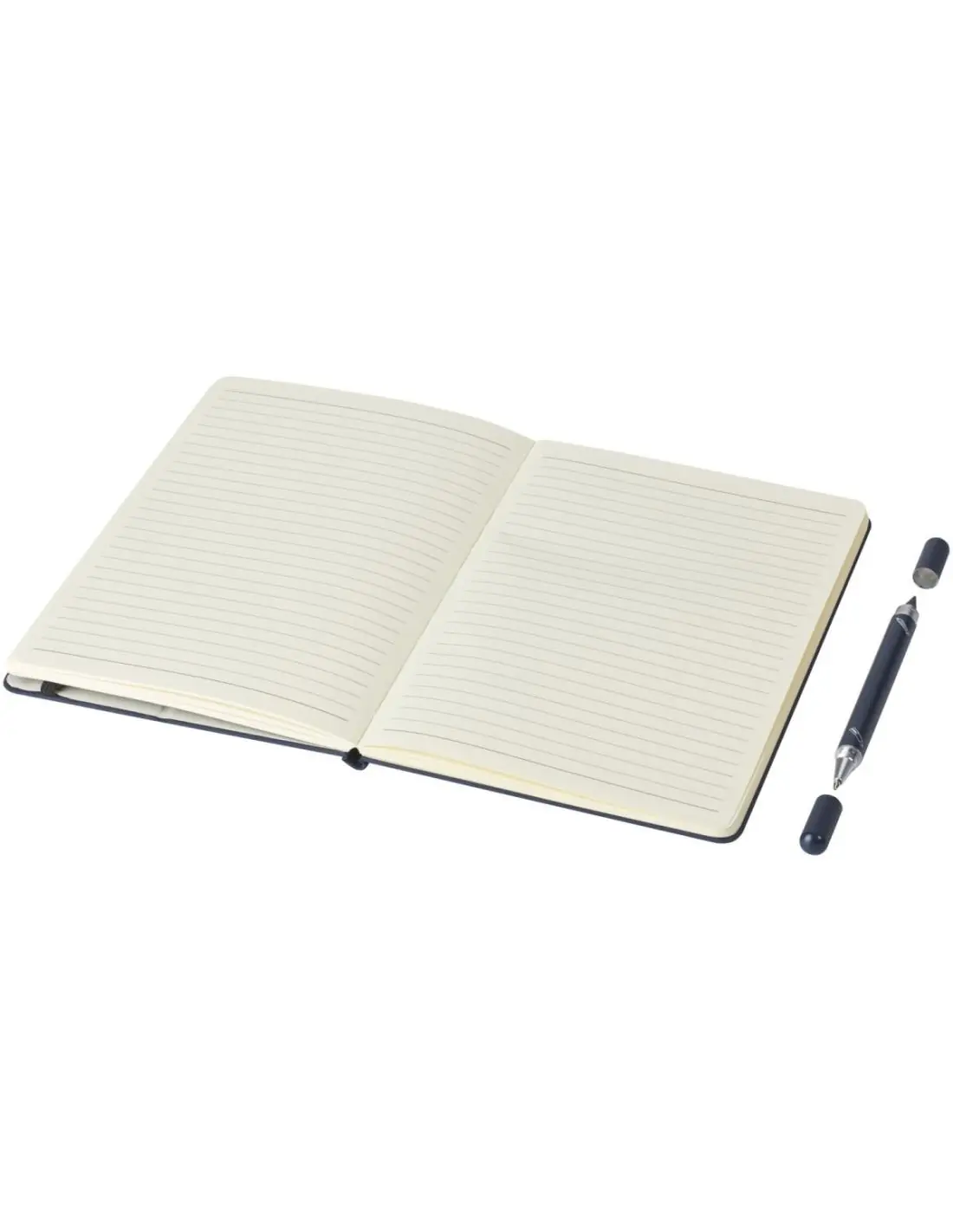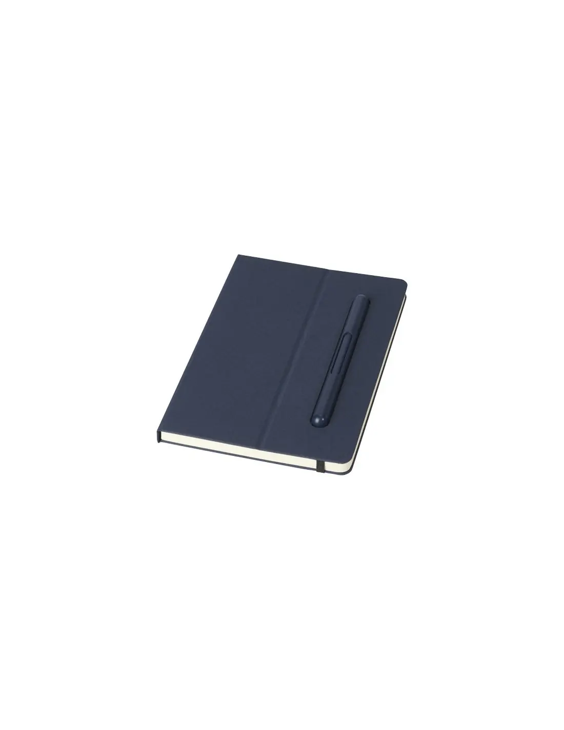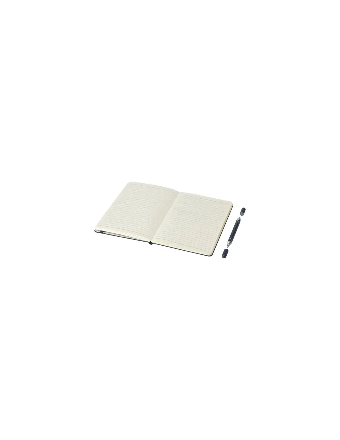 El set de bolígrafo y libreta cuenta con certificación RCS y está parcialmente fabricado con poliéster posconsumo reciclado, por lo que es una opción más sostenible al reducir el uso de materia prima virgen. Dispone de una tapa plegable que lo convierte en un soporte para el móvil. Incluye un bolígrafo de tinta azul y 80 hojas rayadas de papel reciclado de 80 g/m² en color crema procedente de fuentes sostenibles. La longitud de escritura del bolígrafo es de 1000 metros.