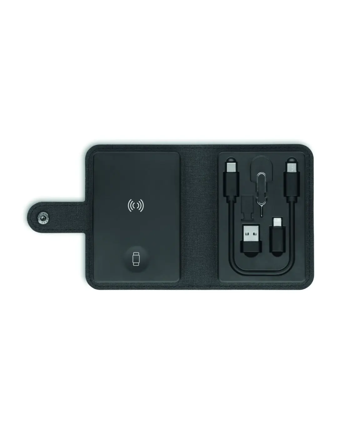 Set de cables conectores con cargador inalámbrico de 15 W y cargador para reloj (sólo Apple®). cable de carga 4 en 1 con herramienta pin extractora. Tapa de PU reciclado y RPET, plásticos de ABS reciclado y placa de aluminio reciclado.