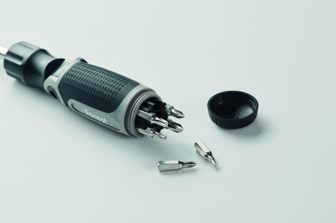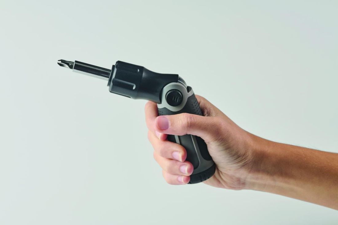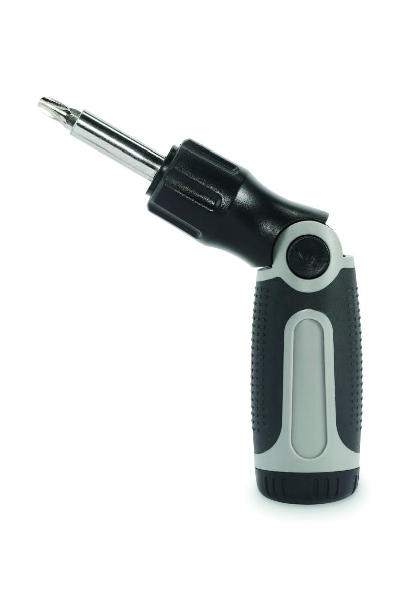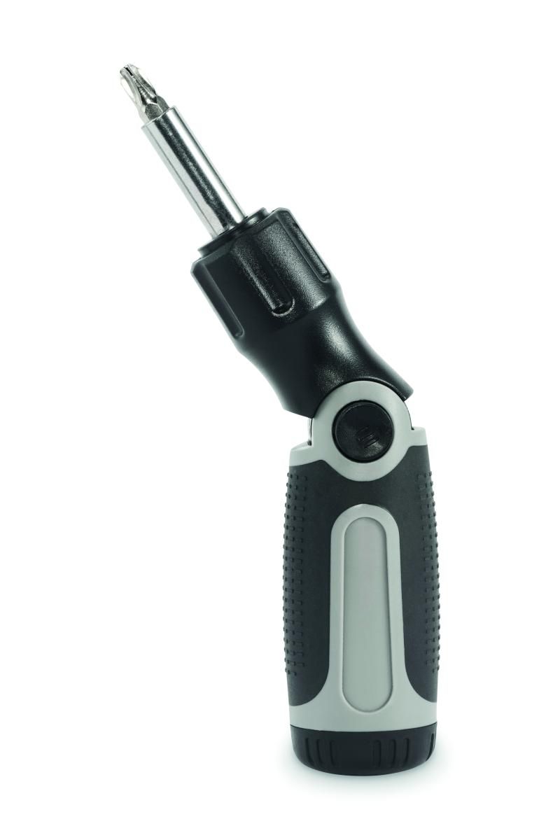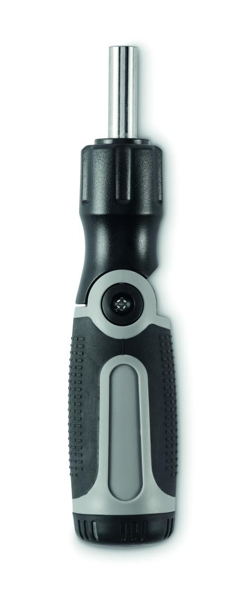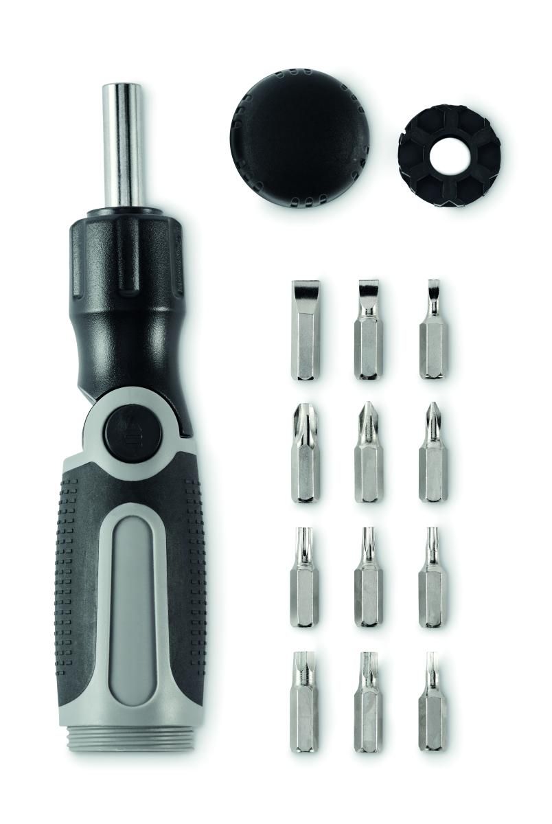 Set de destornilladores plegables con mango de ABS y 12 puntas de hierro que incluyen los tipos Phillips, de cabeza plana, hexagonal y torx.