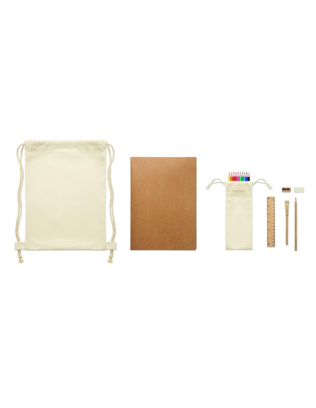 Juego de dibujo infantil y papelería de 5 piezas que incluye regla de madera, sacapuntas de madera, goma de borrar, lápiz de madera y bolígrafo de cartón. 10 lápices de colores adicionales, papel reciclado A4 50 hojas lisas (100 páginas). Presentado en bolsa de algodón con cordón.