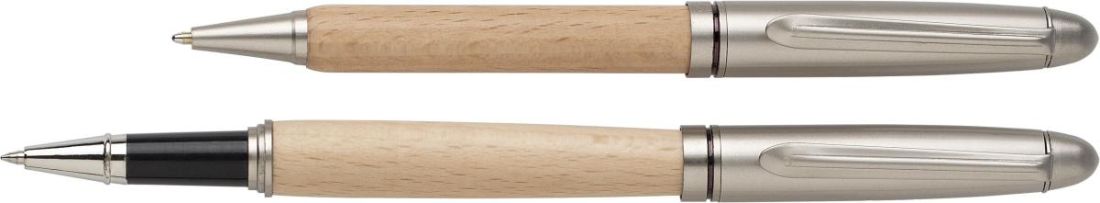 Bolígrafo y roller de madera de haya con acabados de metal. Tinta azul alemana Dokumental. Presentados en un estuche de madera de haya.