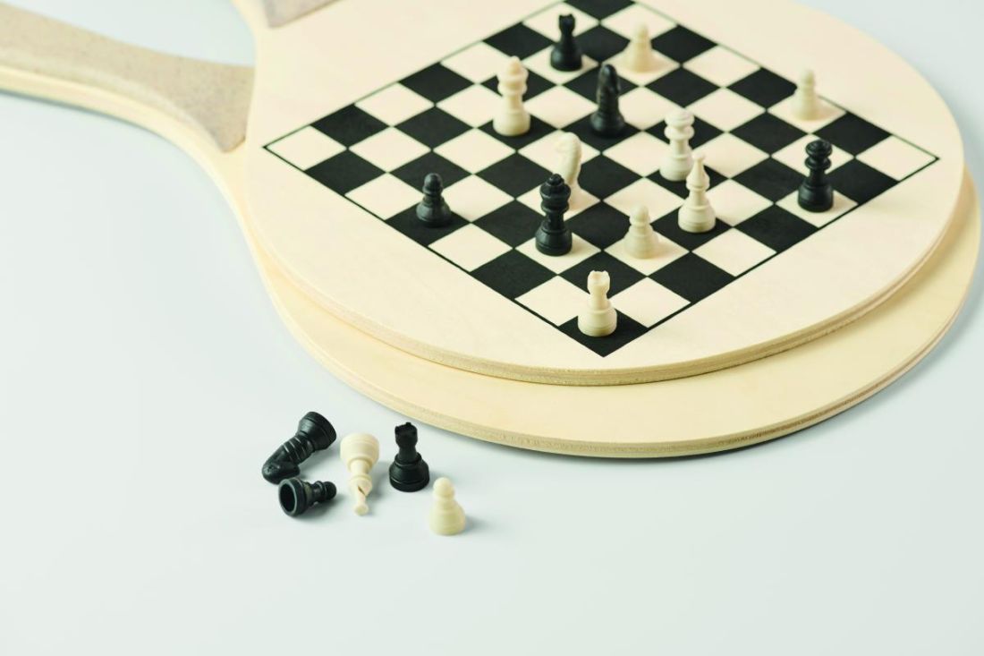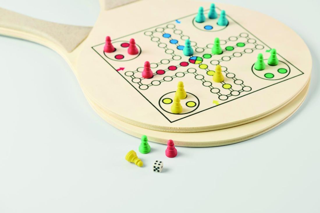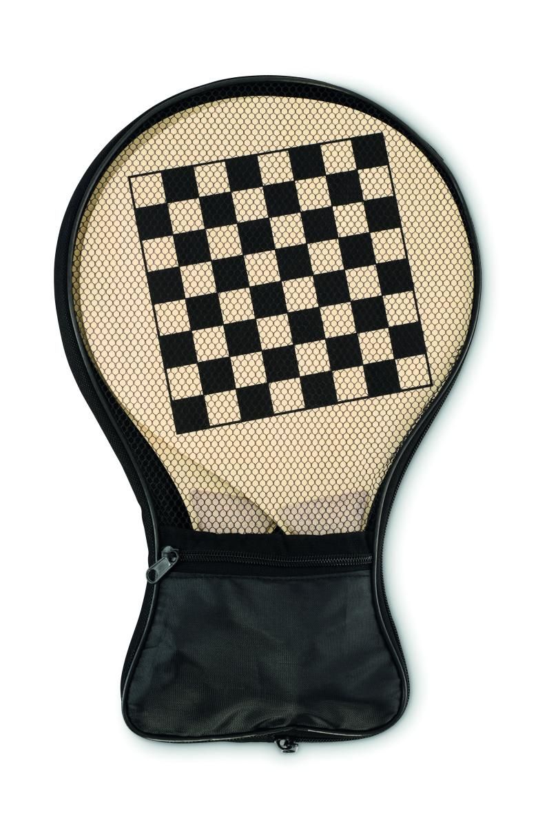 Set de playa con 2 palas de madera con tableros de ajedrez y parchís. Incluye 1 pelota de TPR, dados y fichas. Viene en bolsa de malla RPET con cremallera. Madera contrachapada.