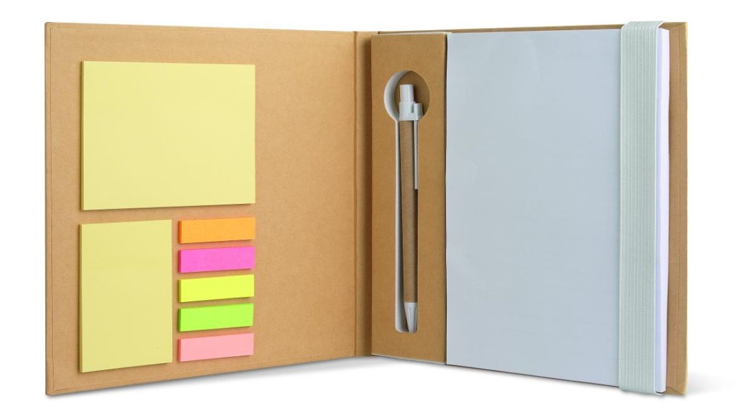 Libreta de papel reciclado con notas adhesivas, bolígrafo y 25 hojas blancas para escribir. FSC®-certified | FSC MIX, P7.1, FSC-C213206