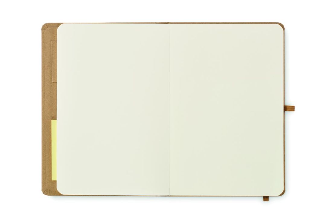 Set de papelería con libreta A5 con tapa de cartón con 80 hojas de papel reciclado (160 páginas) 25 hojas de notas adhesivas y 25 blocs de notas. Banda elástica de cierre y soporte para bolígrafo.