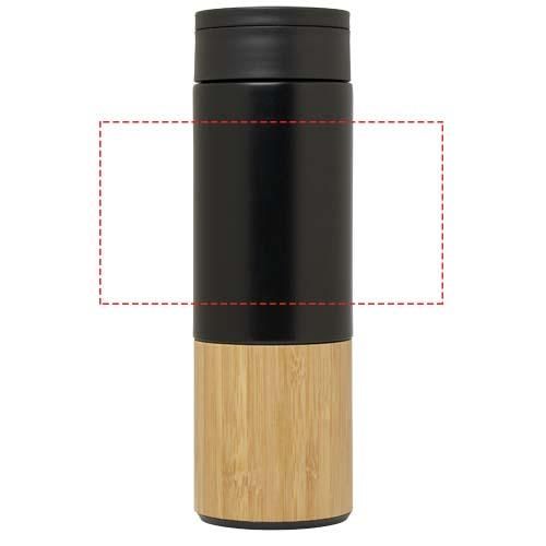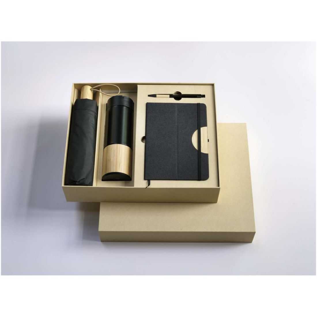 El set de regalo incluye una libreta de tapa dura A5, un bolígrafo, un bidón y un paraguas. La libreta tiene un cierre elástico negro, una cinta marcapáginas y 80 hojas rayadas de color crema de papel de 80 g/m². La tapa de la libreta, junto con el semicírculo de bambú, sirve de soporte para teléfono. El bolígrafo está fabricado en aluminio reciclado con certificación RCS y tiene un revestimiento negro pulverizado y empuñadura de bambú. Tinta del bolígrafo: Negro. Longitud de escritura: 1000 metros. El bidón de 450 ml está fabricado en acero inoxidable y tiene un accesorio de bambú en la parte inferior. Lavado a mano únicamente. Tamaño del bidón: 6,6 × 22,2 cm. El paraguas de 21" tiene una capa externa de tafetán negro, eje de metal negro, varillas de fibra de vidrio negra y mango de bambú. Tamaño del paraguas: 28,3 x 5,5 cm. Tamaño de la caja de regalo: 36 × 30 × 8 cm.