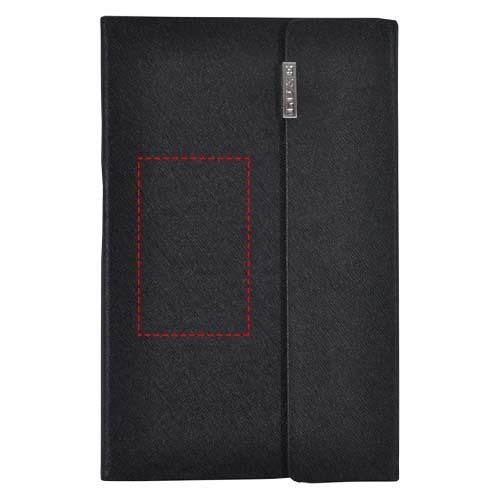 Cuaderno de diseño exclusivo (referencia A5) con cubierta de PU térmico, cinta negra marcapáginas, cierre magnético y papel satinado de color crema de 80 hojas (80 g/m²). A juego con el bolígrafo...