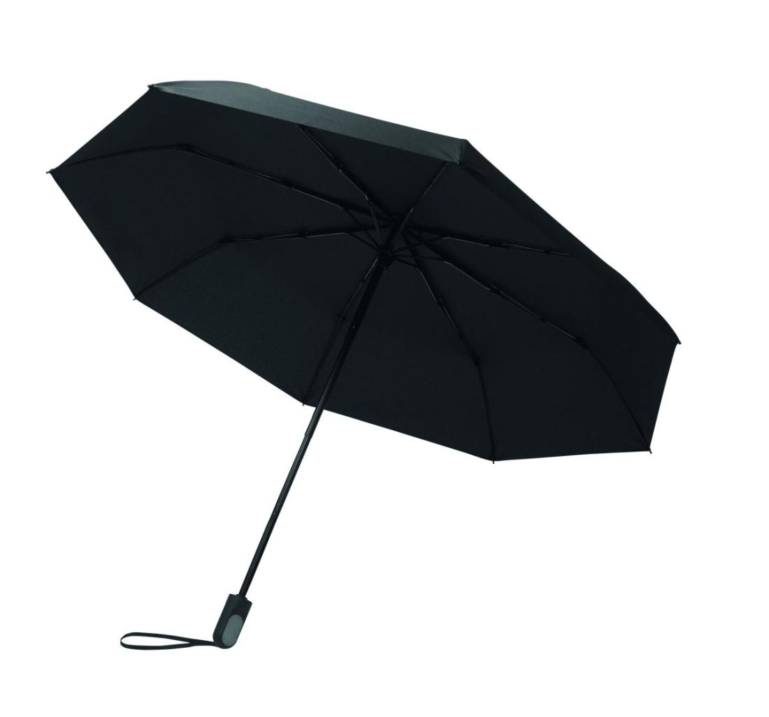 Set de regalo 2 piezas: botella de acero inox. reciclado de doble pared 600ml y tapa de PP, detalle metálico y asa de silicona más paraguas plegable de 21'' antiviento asa de ABS en caja de regalo.