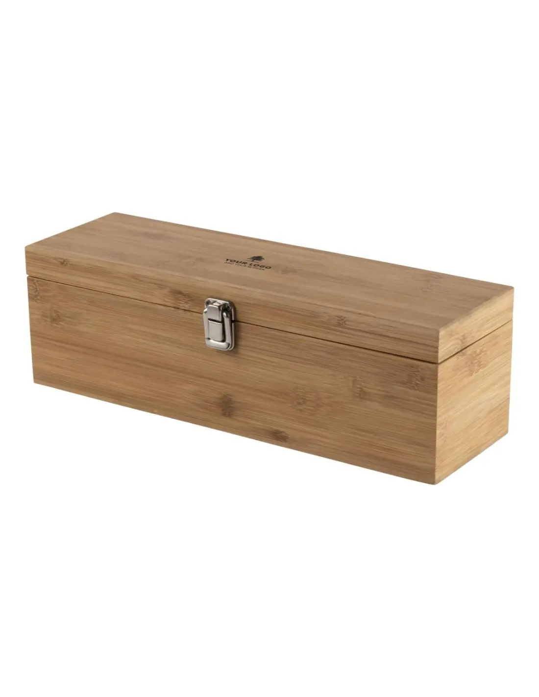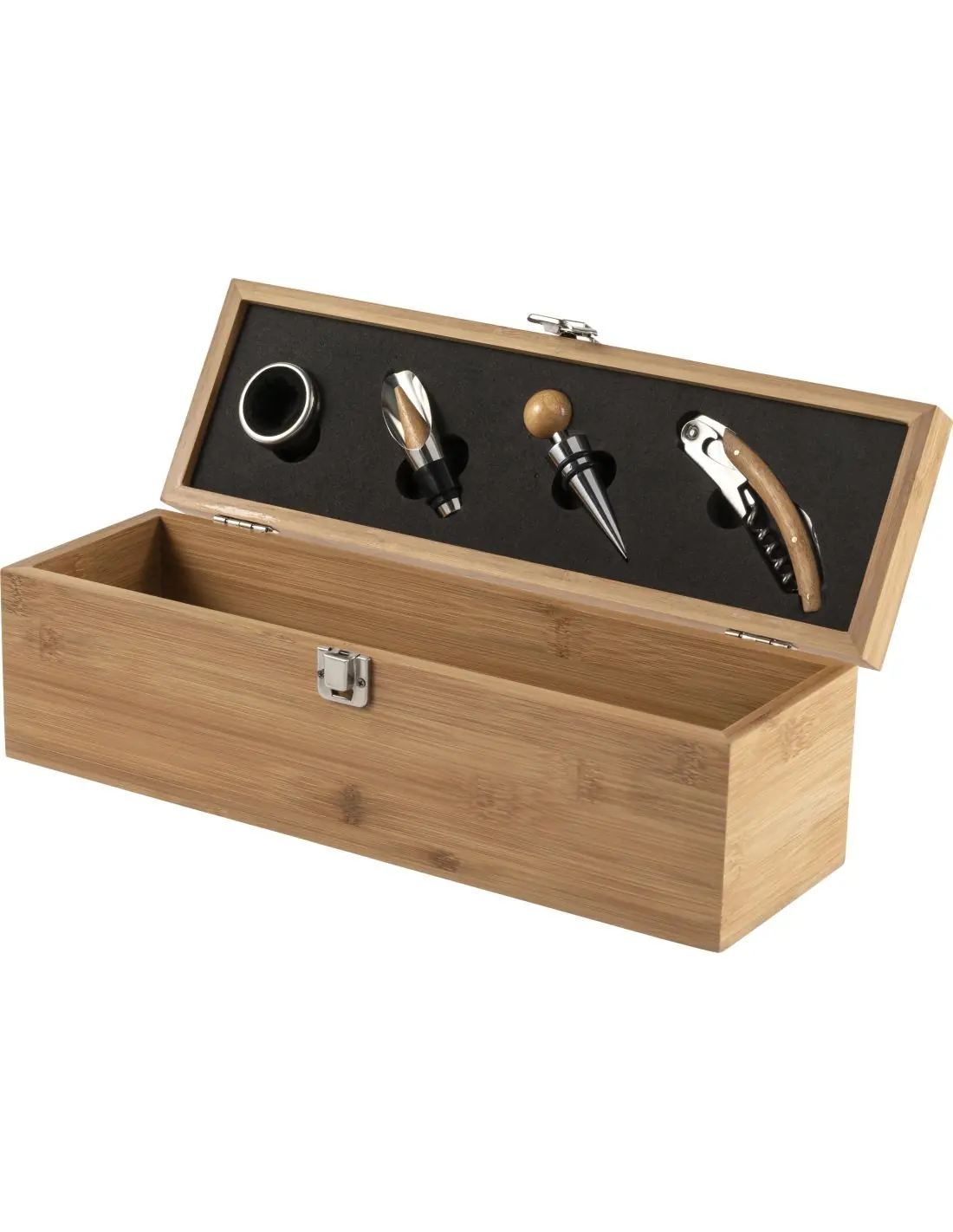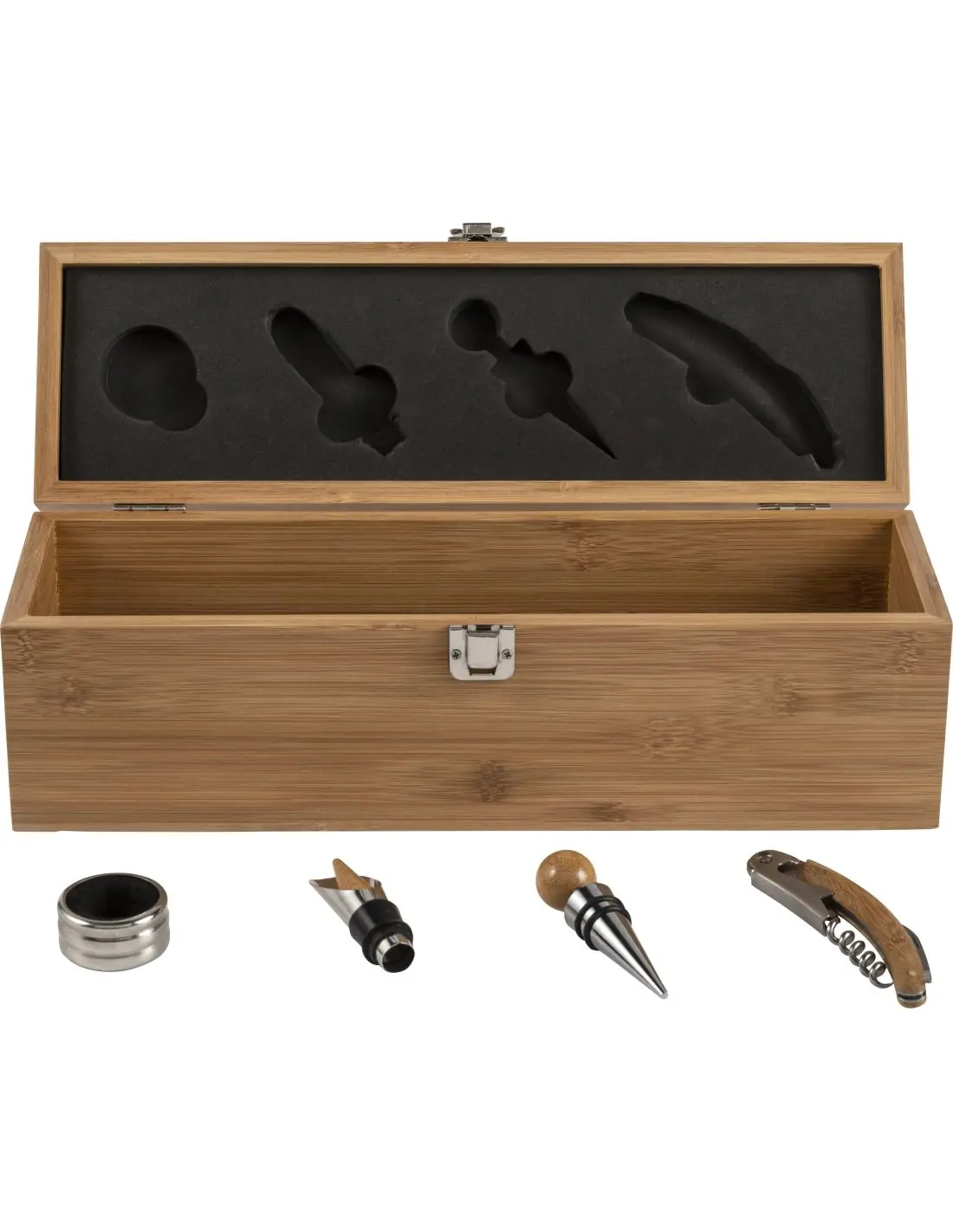Set de vino de acero inoxidable y bambú: argolla antigoteo, vertedor, tapón y sacacorchos. Presentado en una caja de bambú.