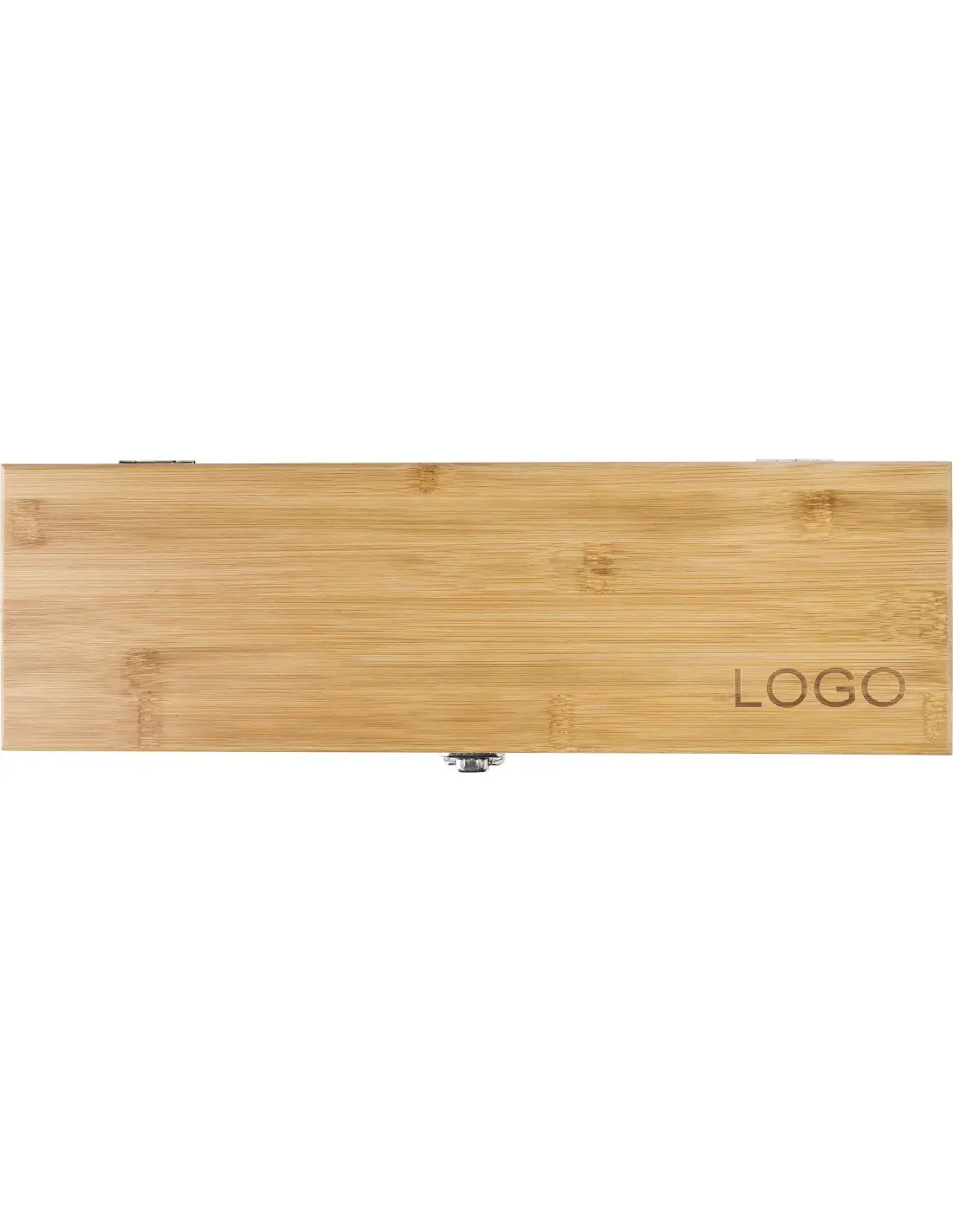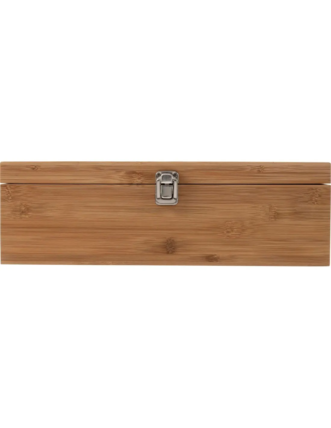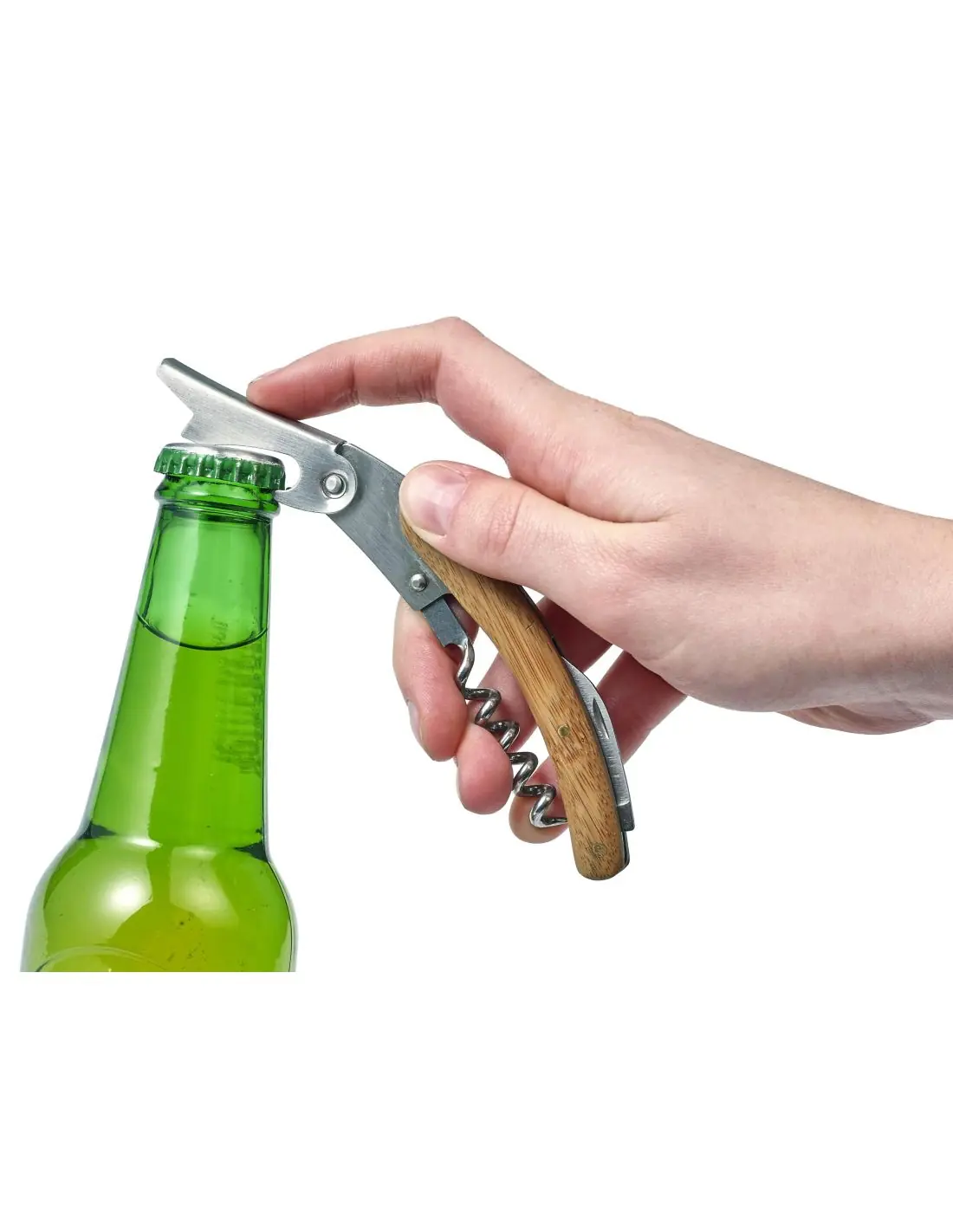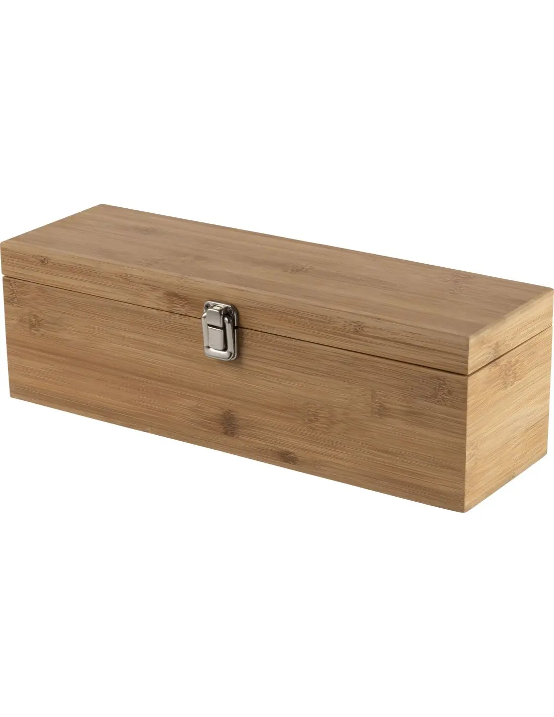 Set de vino de acero inoxidable y bambú: argolla antigoteo, vertedor, tapón y sacacorchos. Presentado en una caja de bambú.