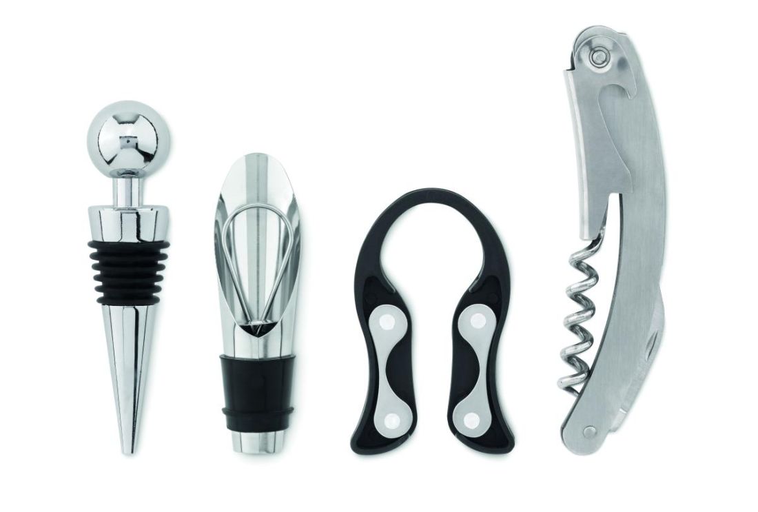 Soporte de madera y set de 4 accesorios para vino: sacacorchos, tapón, dosificador de vino y corta cápsulas.