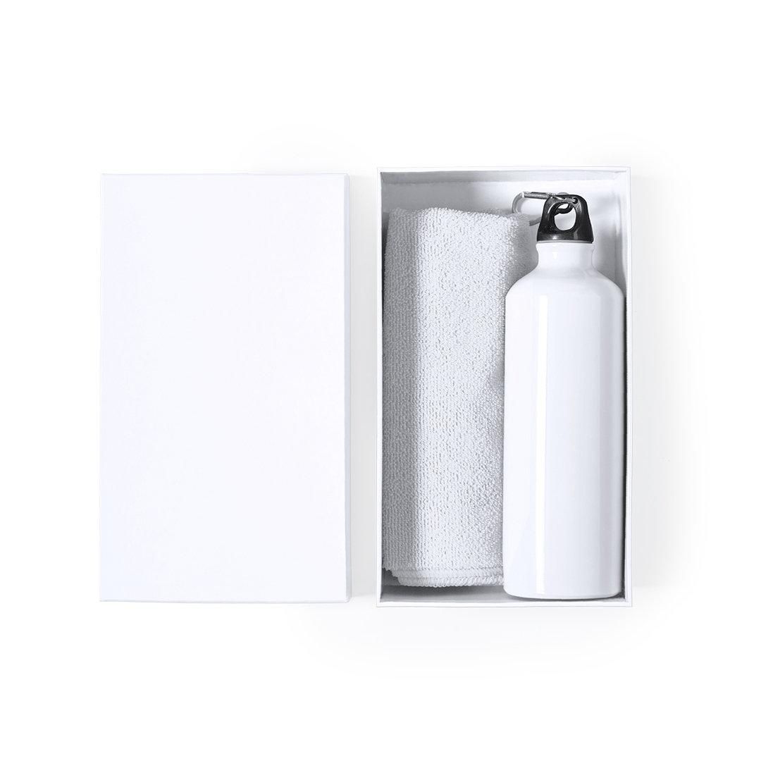 Set de bidón y toalla a juego. Incluye: Bidón de 800 ml de capacidad con cuerpo en aluminio de acabado brillo. Con tapón de seguridad a rosca y mosquetón metálico de transporte. Toalla absorbente fabricada en microfibra de 160g/m2 y tamaño 40x90 cm. Set disponible en variada gama de colores y presentado en caja de cartón con colores a juego.