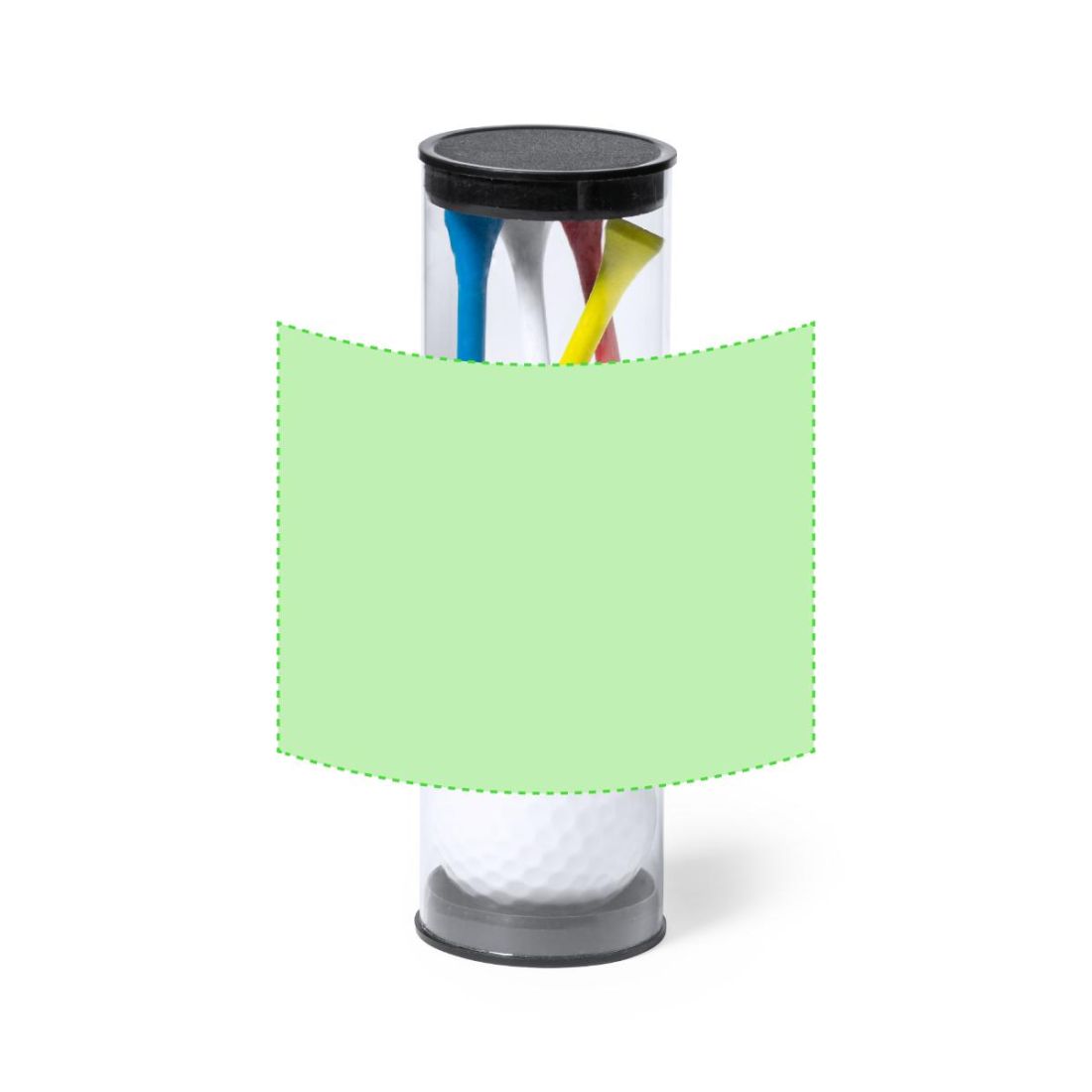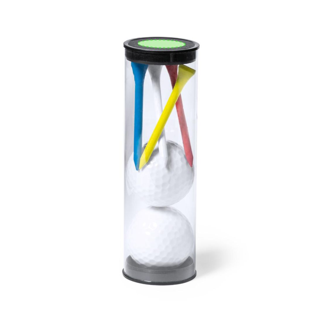 Completo set de golf de 6 accesorios. Incluye 2 pelotas blancas de doble capa y 4 tees de madera en colores amarillo, azul, blanco y rojo. Presentación en bote transparente con tapón.