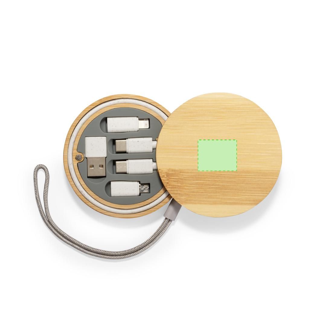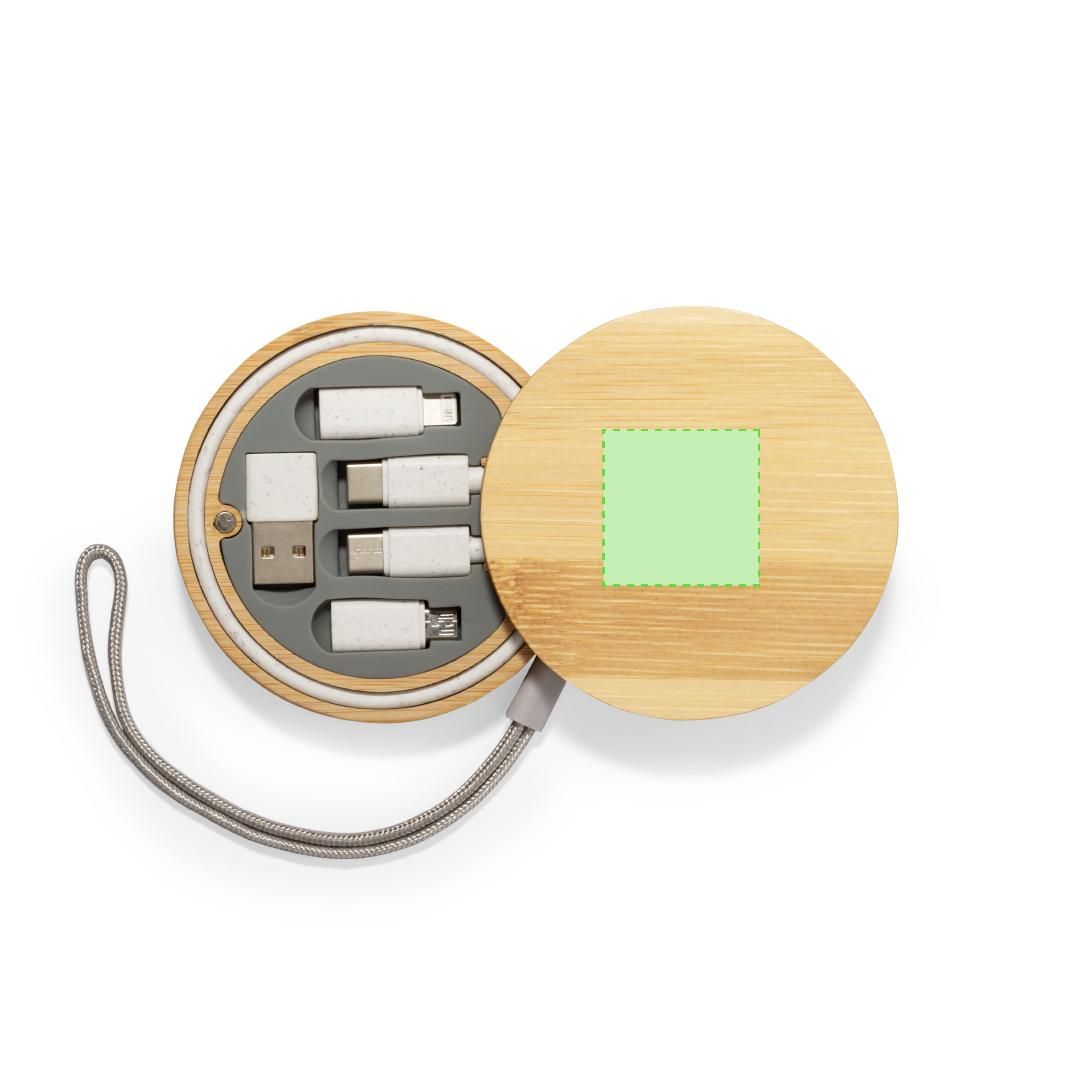 Completo set de cables cargadores fabricado en fibra de trigo, con estuche de bambú pulido y asa de transporte. Incluye cable con capacidad de transferencia de datos y múltiples conexiones, con cabezales Micro USB, Tipo C y Lightning. 5V DC 3A. Presentado en caja diseño kraft.Elaborado con elementos vegetales para así fomentar la utilización de materias primas naturales y reducir las emisiones contaminantes.