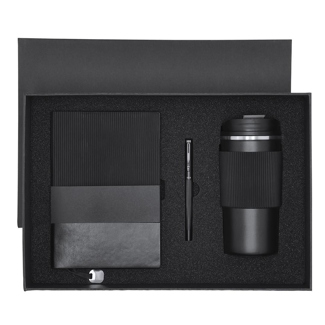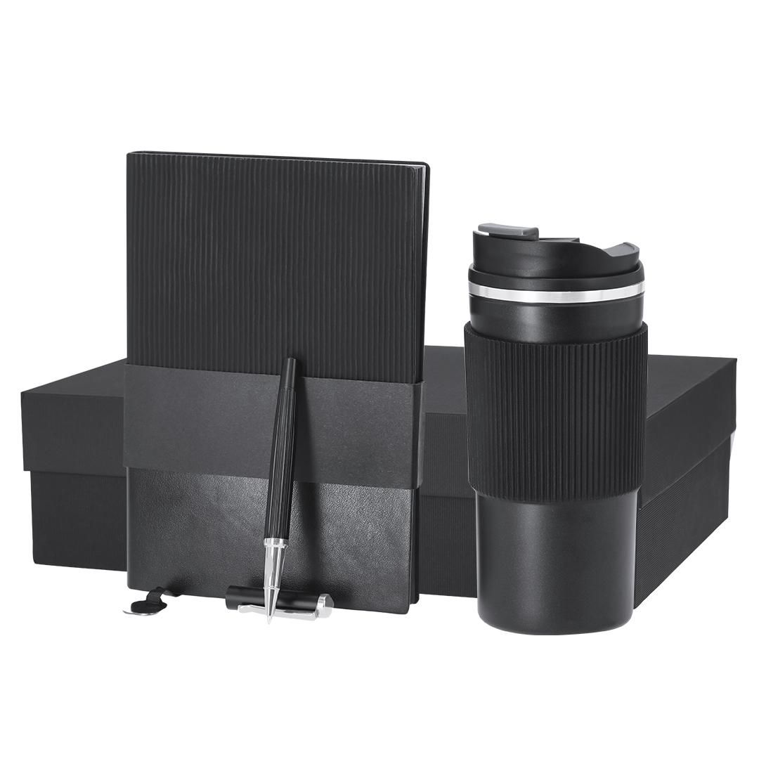 Elegante set premium. Incluye: - Vaso térmico fabricado en acero inoxidable de doble pared con capacidad de 470 ml. Con un dosificador en tapadera, libre de BPA, sistema de apertura abre fácil, banda de silicona a juego y base antideslizante. - Bloc de notas con tapas blandas fabricado en elegante PU color negro. Su diseño combina texturas lisas y biseladas. Incluye marcapáginas de tela con accesorio metálico especial para marcaje en láser. Interior con 100 hojas en color crema, de disposición a una raya y bordes en negro. - Roller de acabado negro mate con detalles metálicos en color plata. De cuerpo biselado, con cierre de capucha, clip y tinta azul. Cuenta con cómodo agarre en metal pulido.Presentado en sosfisticado estuche individual de acabado mate, con interior troquelado para cada uno de los elementos del set.