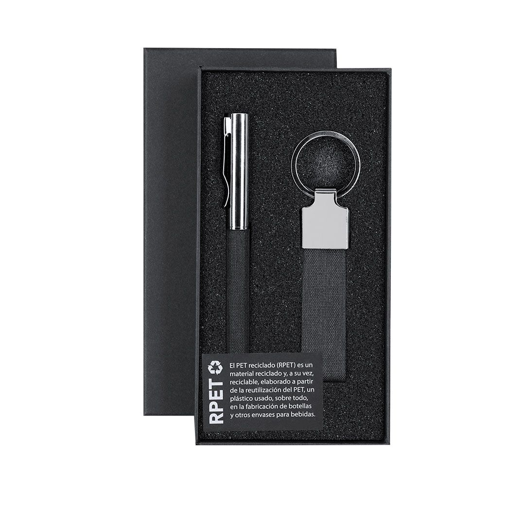 Elegante set en RPET con acabado negro bitono y detalles metálicos. Incluye:-Bolígrafo de RPET de acabado negro bitono y detalles metálicos. Con mecanismo giratorio y tinta azul.-Llavero en RPET de acabado color negro bitono y accesorios cromados.Presentado en estuche individual negro. Incluye tarjeta negra interior con distintivo RPET.El material RPET se elabora a partir de plástico reciclado, para así fomentar la reutilización de residuos plásticos y ayudar a la sostenibilidad del planeta.