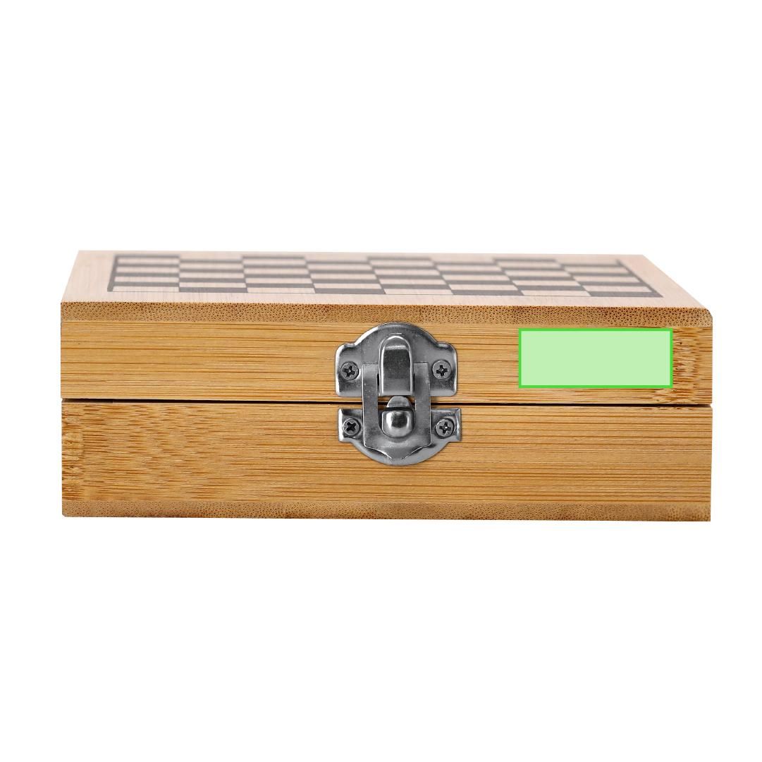 Set de juegos con acabado en bambú y diseño en forma de tablero de ajedrez. Incluye cierre de seguridad, juego de ajedrez, dados y cartas de póker. Presentado en un elegante estuche con tablero de ajedrez y un interior de espuma troquelada.