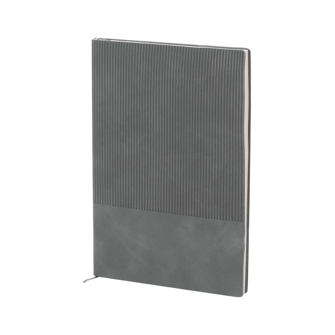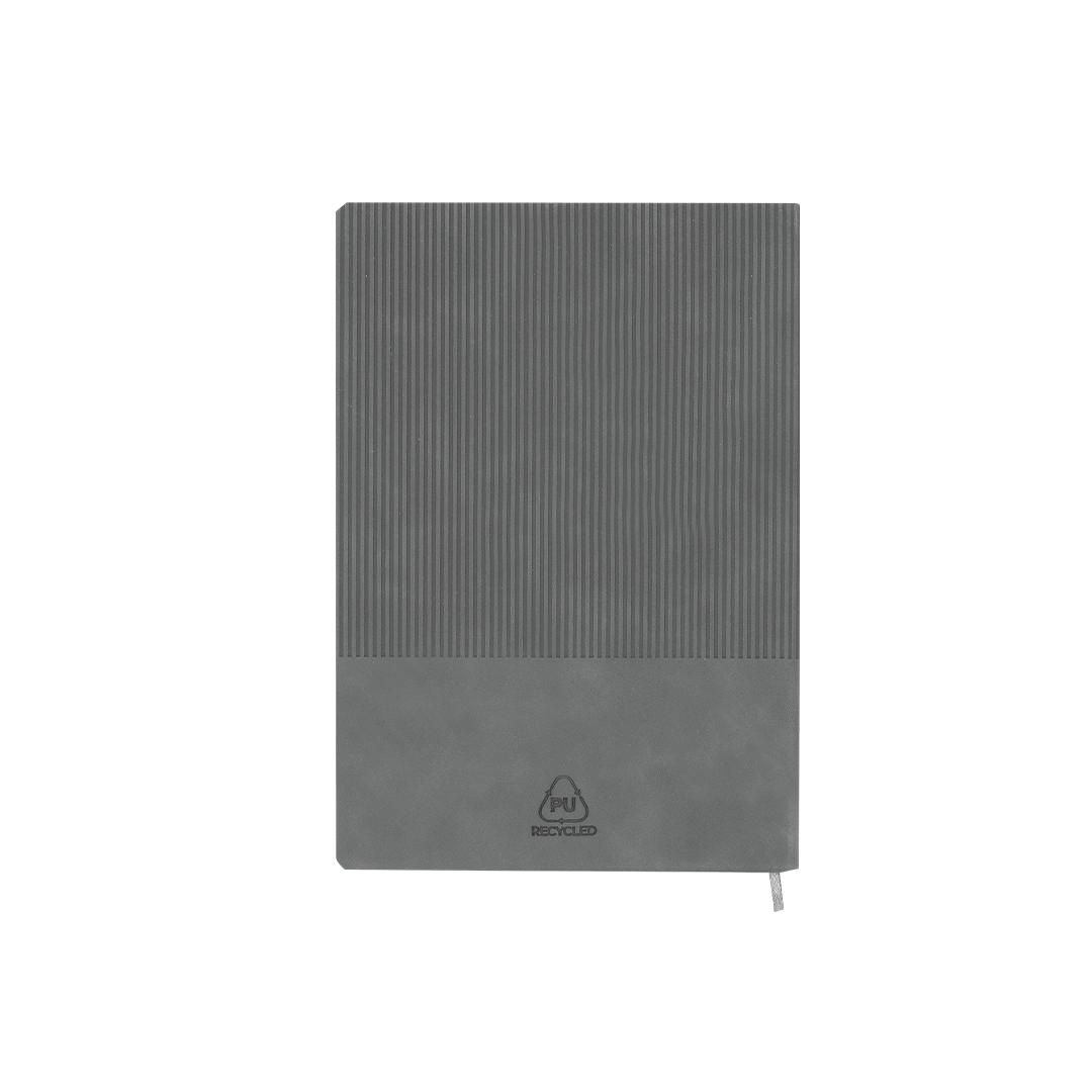 Set de bloc de notas y bolígrafo fabricados en PU Reciclado y Aluminio Reciclado. El set incluye: - Bloc de notas fabricado en PU Reciclada, con tapas flexibles . Incluye 96 páginas de color crema con líneas, un marcapáginas a juego. Con distintivo PU Reciclada. - Bolígrafo de aluminio reciclado, con cuerpo en acabado caucho. Dispone de clip mecanismo pulsador y tinta azul. Incluye distintivo de aluminio reciclado.