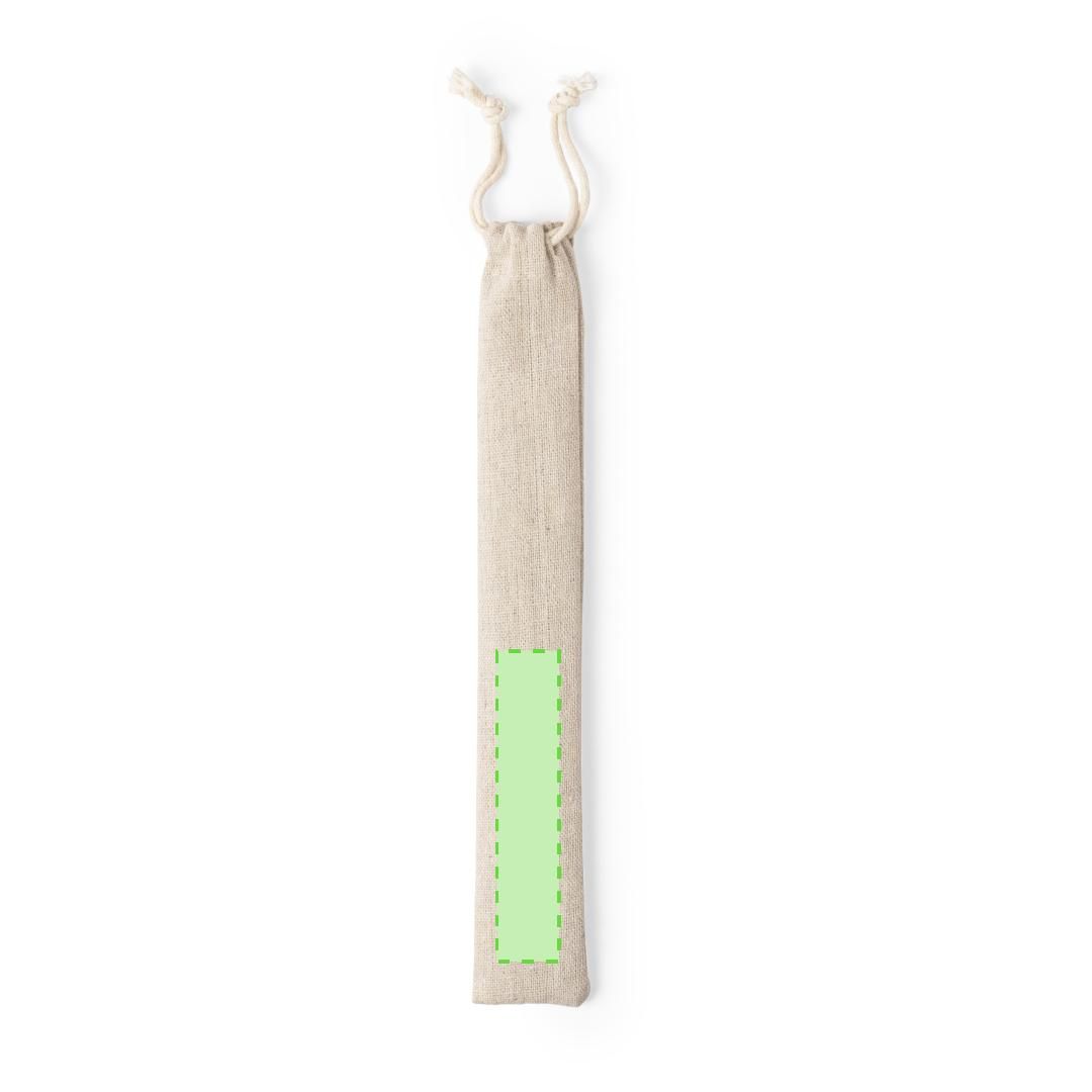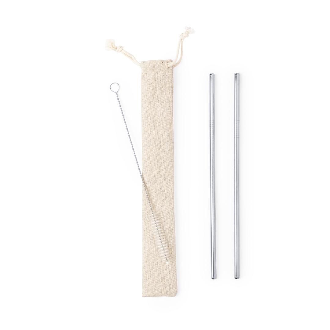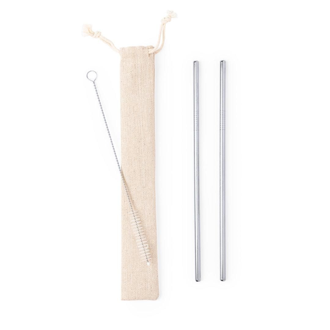 Set de 2 pajitas reutilizables en acero inoxidable. Con accesorio limpiador incluido y presentadas en bolsita de algodón natural con cuerdas autocierre.