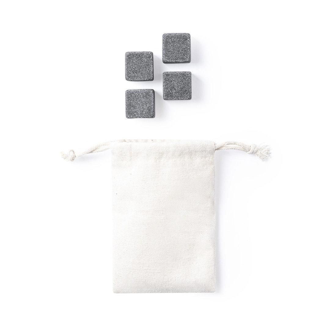 Set de 4 cubitos reutilizables. Fabricados en piedra natural esteatita, también conocida como piedra o roca de jabón, que mantiene la bebida fría sin alterar sus propiedades al no diluir su contenido en agua, además de mantener el sabor original de la misma. Presentados en funda de algodón con cordón de cierre.