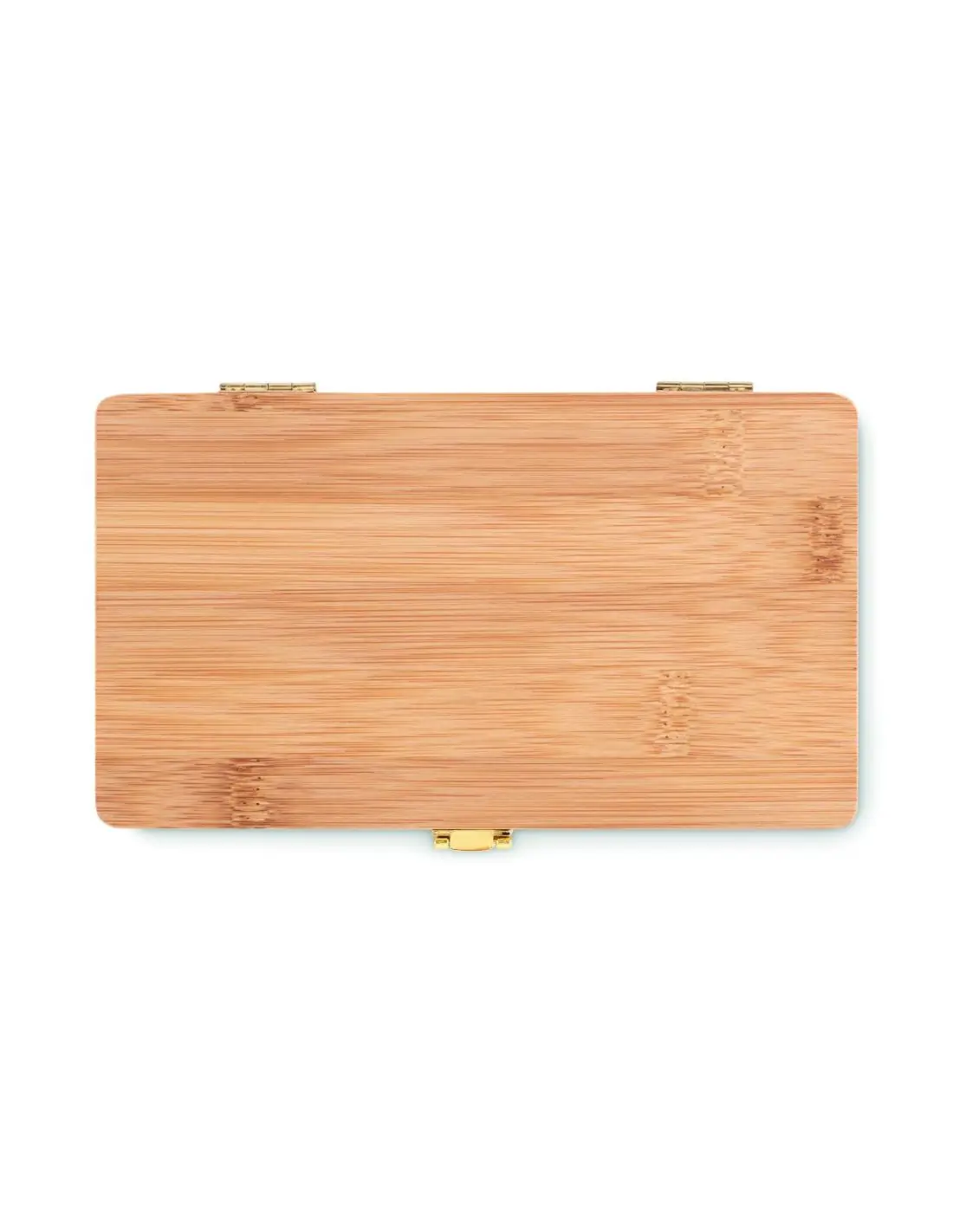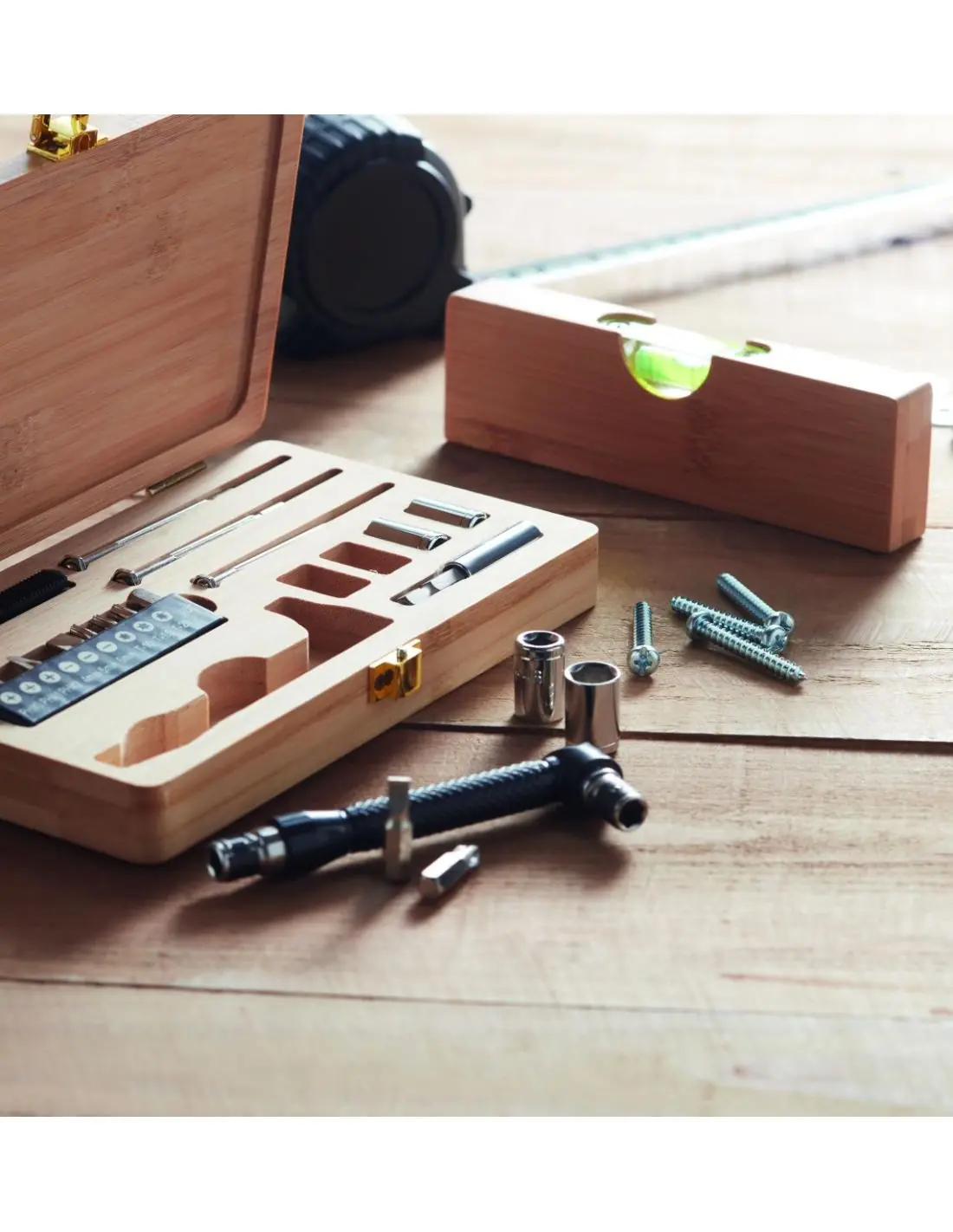 Set de herramientas con 21 piezas presentado en un estuche de bambú que contiene 3 destornilladores, 10 cabezales, 3 planos, 3 Torx y 1 adaptador, 4 llaves de vaso , 1 cúter, 1 carraca y 1 prolongador de carraca. FSC®-certified | FSC 100%, N5.7, FSC-C213206