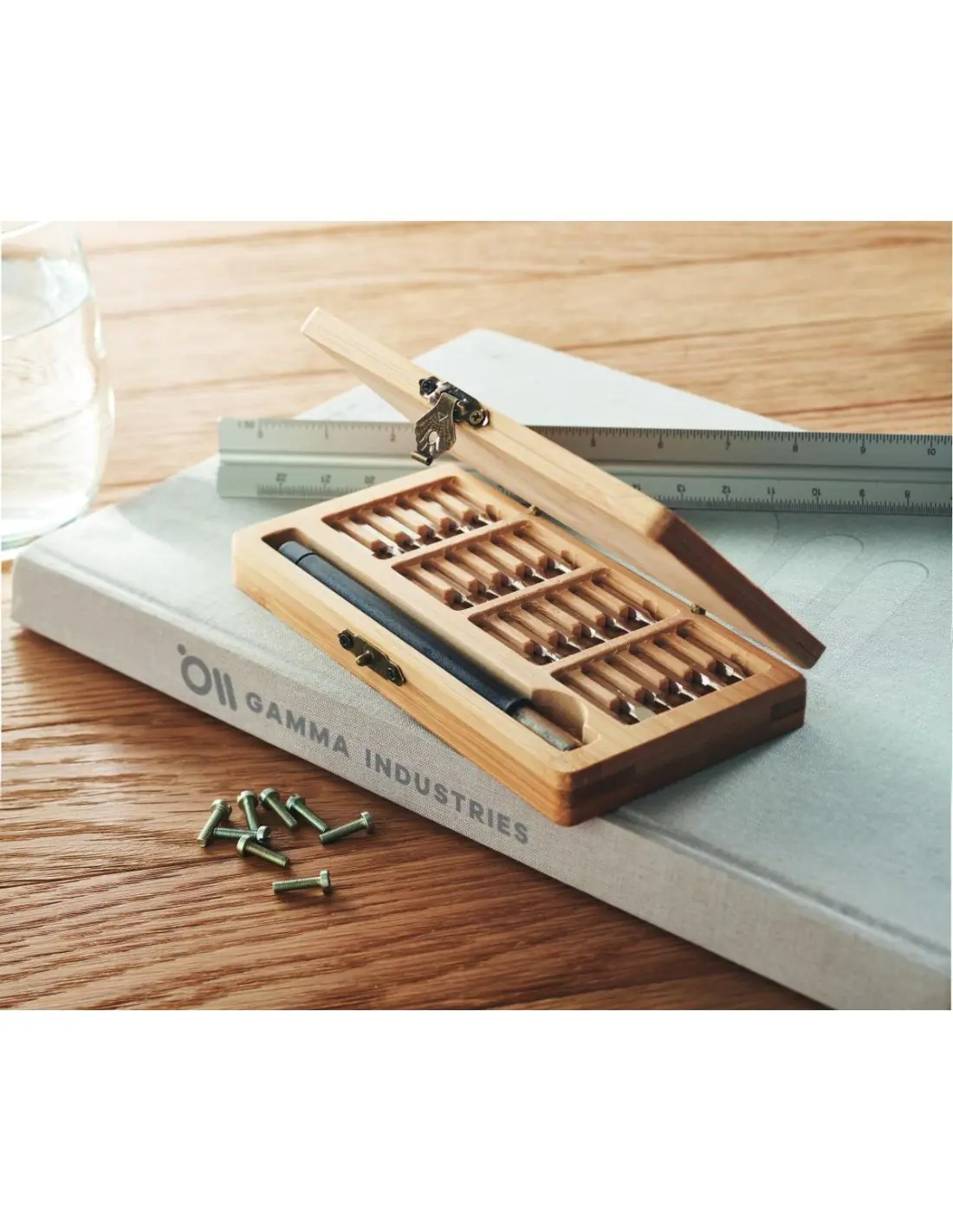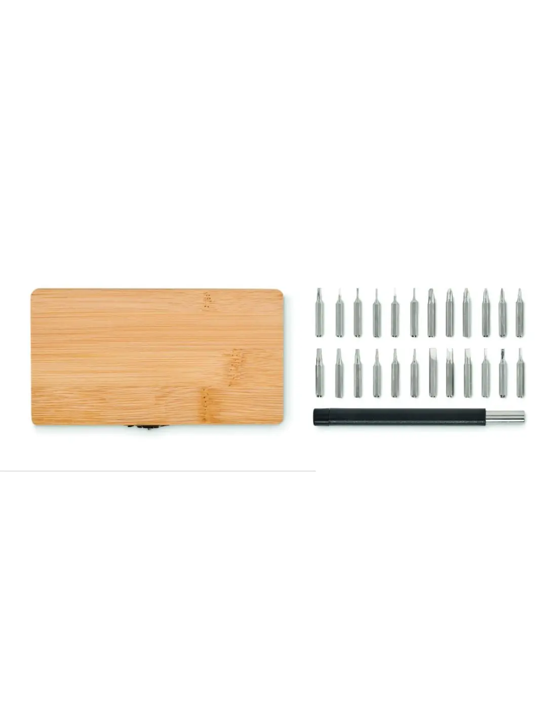 Set de 24 destornilladores de precisión presentado en un estuche de bambú con cierre de hebilla. El bambú es material natural, el color del articulo puede variar.