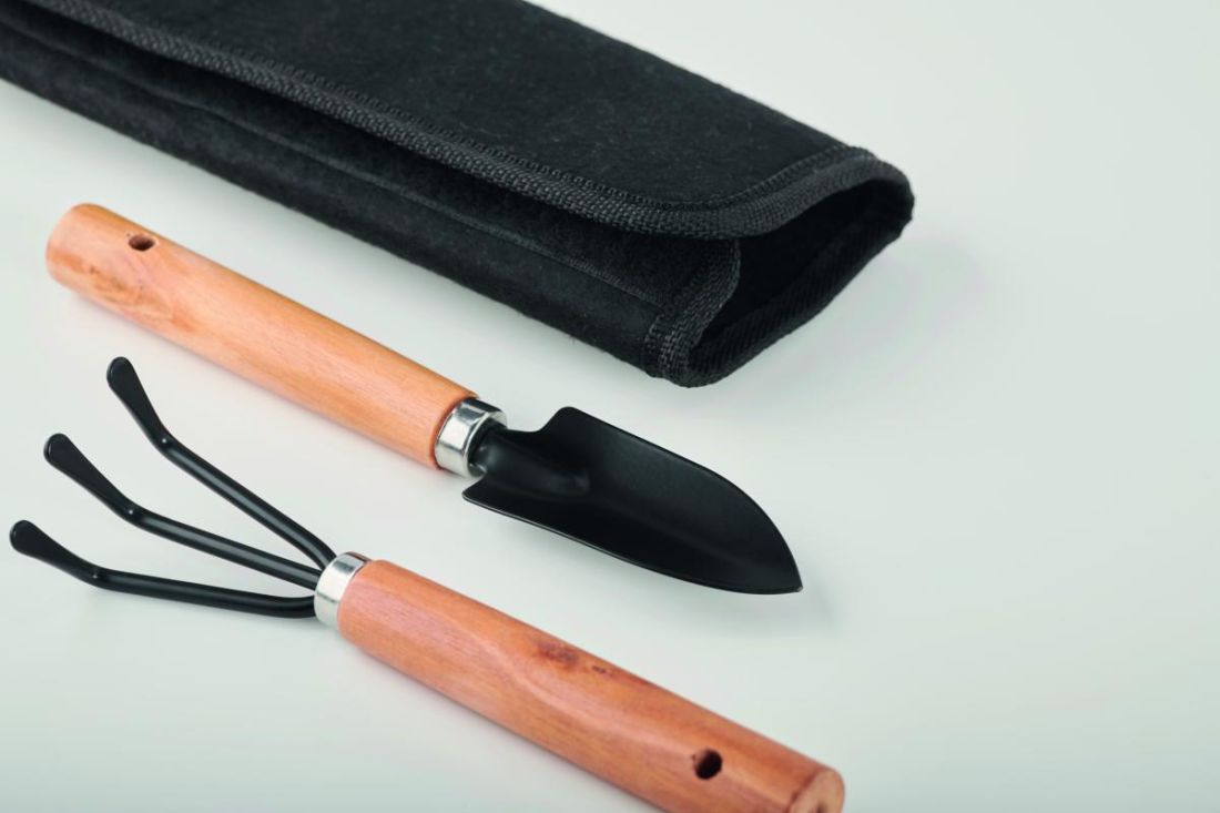 Set de 3 herramientas de jardinería. Rastrillo y 2 palas. Presentado en bolsa de fieltro RPET.